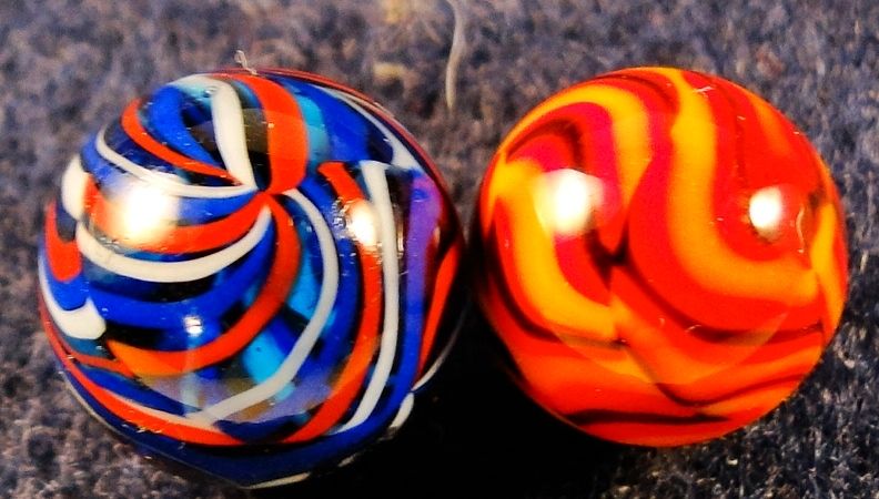 CONTEMPORARY HANDMADE, Scott Patrick. Lot of two marbles. Both are swirl type. Different colors. Unsigned (Scott rarely signed his marbles). 17/32" & 15/32". Mint (9.9).