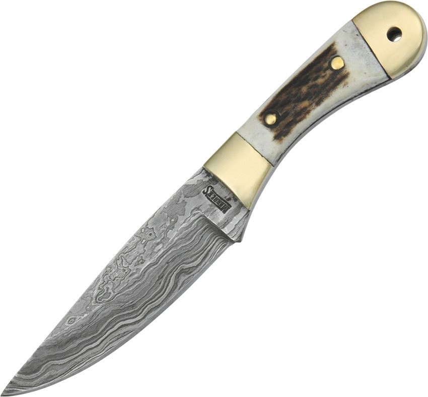 6" overall. 3 1/8" damascus steel blade. Full tang. Genuine stag handles with bolsters. Lanyard hole. Brown leather belt sheath.