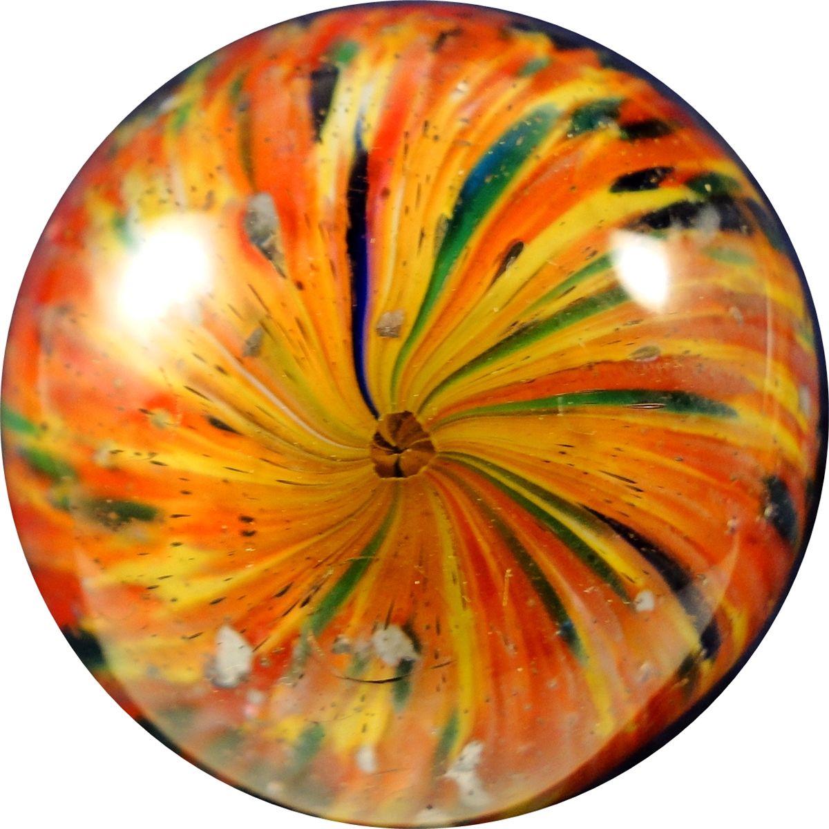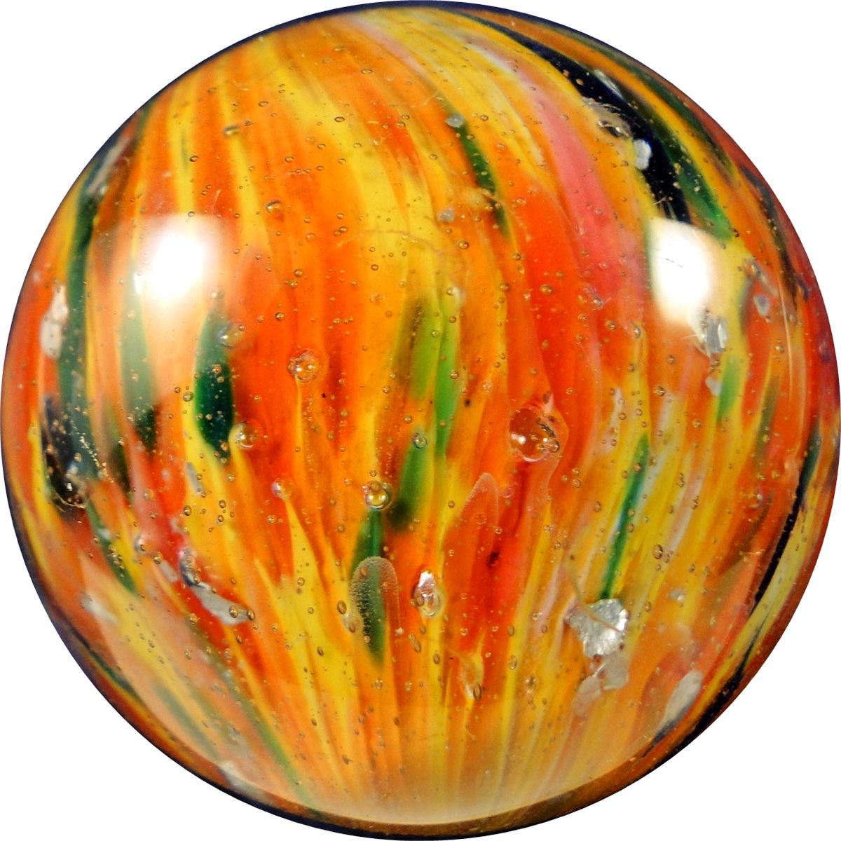 END OF DAY, Onionskin. Gorgeous Onionskin with mica. Yellow core with red, green and blue stretched on it. Nice flakes of mica on the core. Reverse twist top. Germany, circa 1870-1920. 1-9/16". Polished. Provenance: Accompanied by a COA from LandofMarbles.com authenticating that this marble was recovered from a shipwreck off Long Island. The marble was subsequently polished to restore a clean surface.