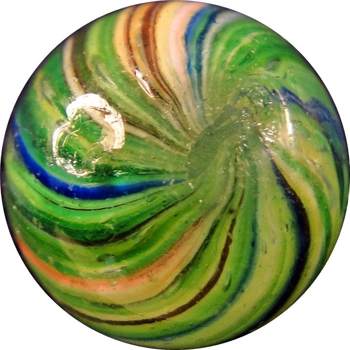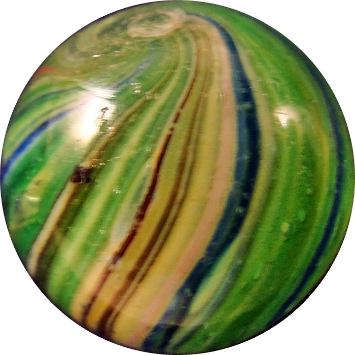 END OF DAY, Onionskin. Beautiful green and white Onionskin with some blue streak. Two tiny melt spots and one very tiny flake. It views much better than the grade would indicate. Germany, circa 1870-1920. 21/32". Near Mint(+) (8.9).