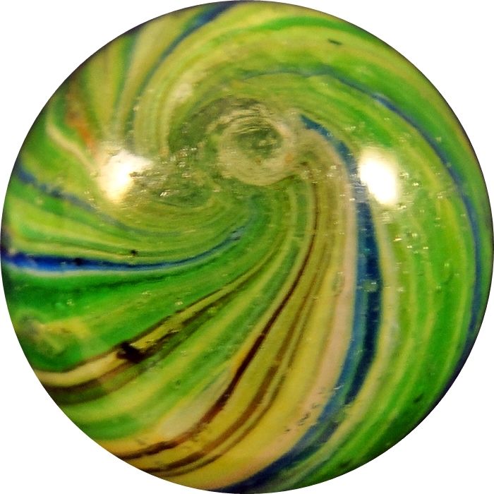 Mint (9.9-9.0). A marble that is in its original condition is identified as Mint. The surface is unmarked and undamaged. There may be some minor rubbing on the surface of the marble is as it came from the factory.