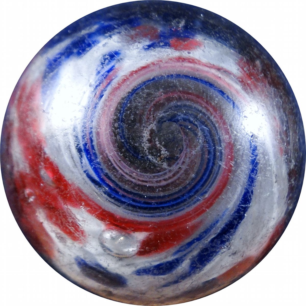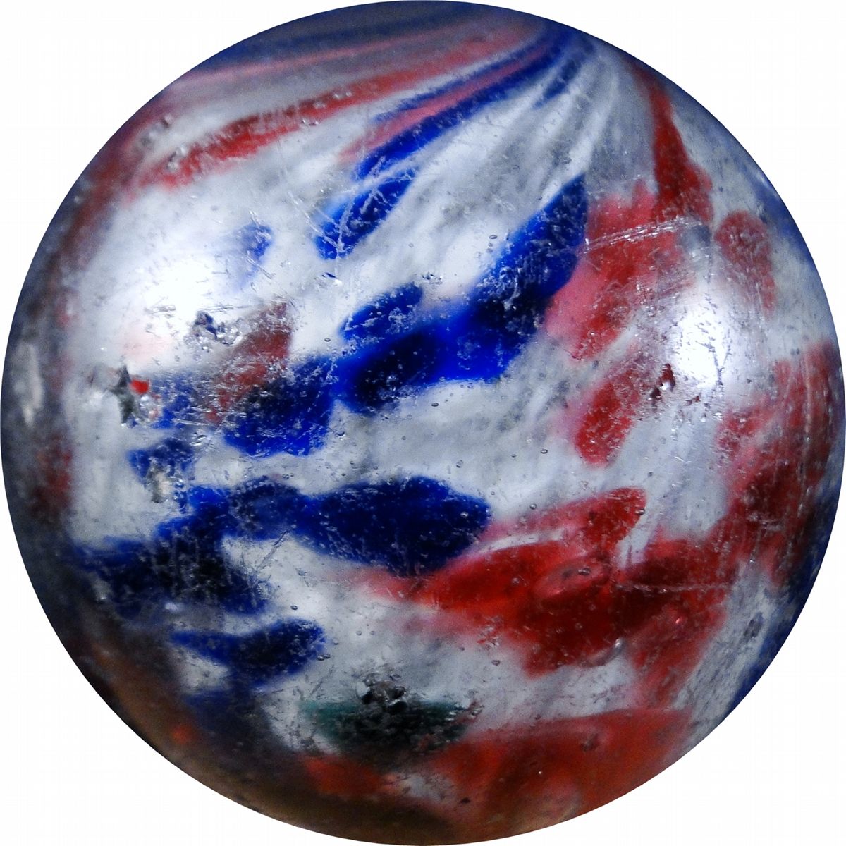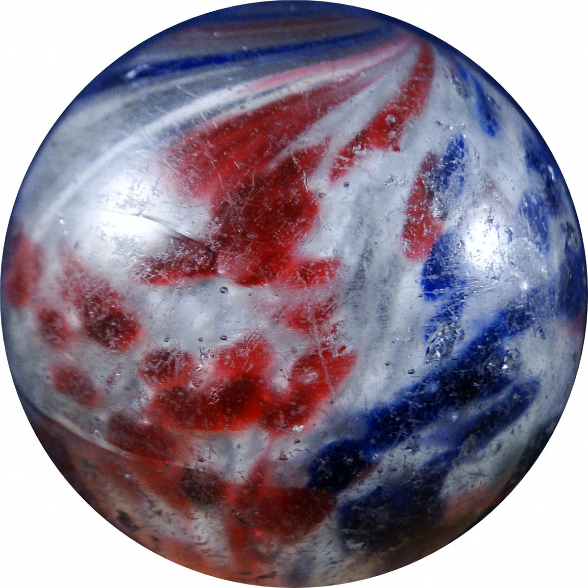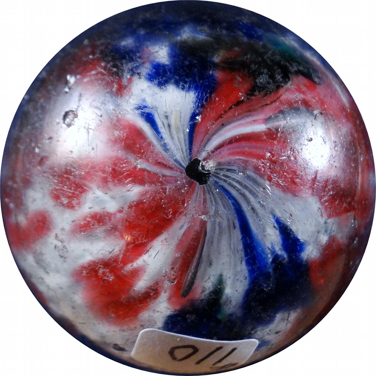 END OF DAY, Paneled Onionskin. Four-panel Onionskin. White core. Two blue panels, two red panels. Very nice coloring and texture to the core and onion surface. Overall light wear and pits. A couple of very small subsurface moons. A very light buff will reveal a beauty. Germany, circa 1870-1920. 1-7/8". Good(+) (7.8).
