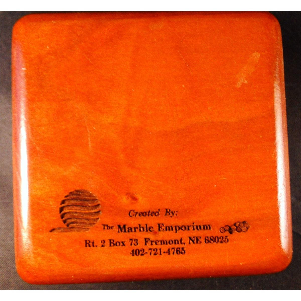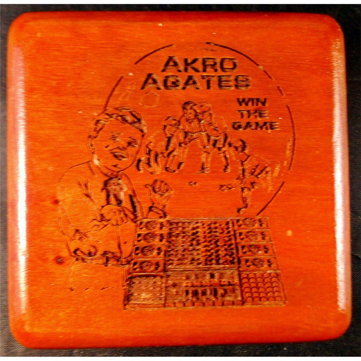 Modern cherry clamshell type box that holds six marbles 21/32" or smaller. Magnetic catch. Top is laser engraved with image from an Akro advertisement. Back is laser engraved identifying the creator as The Marble Emporium. Box is 2-3/4" x 2-3/4". In nice condition.