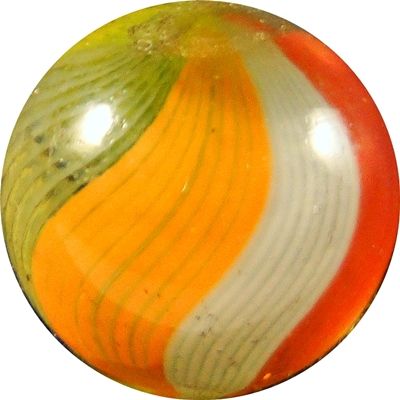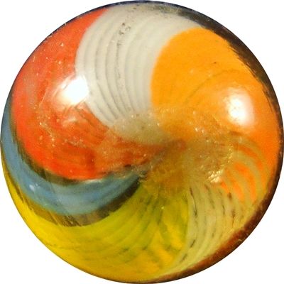Lot 139. SWIRL, Joseph Coat. Exceptional example. Six-Panel Joseph Coat Swirl. The surbsurface layer is six panels: Two are white, one red, one orange, one yellow, one blue. Each layer consists of packed strands. Superb! Germany, circa 1870-1920. 17/32". Mint (9.9).