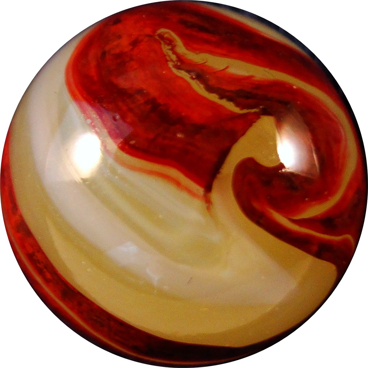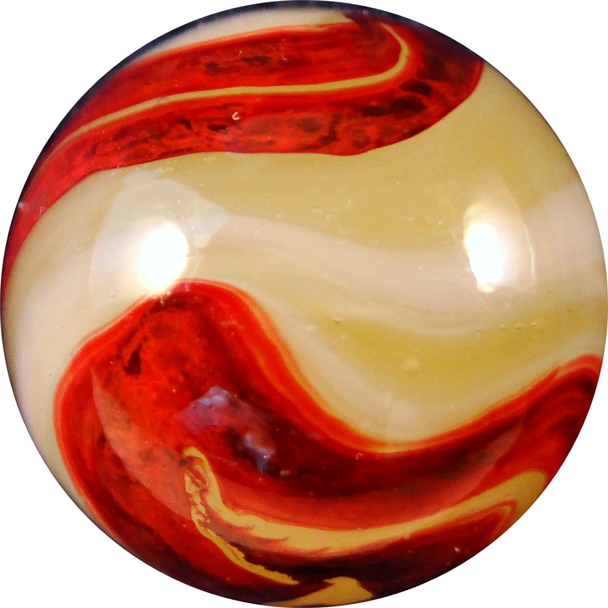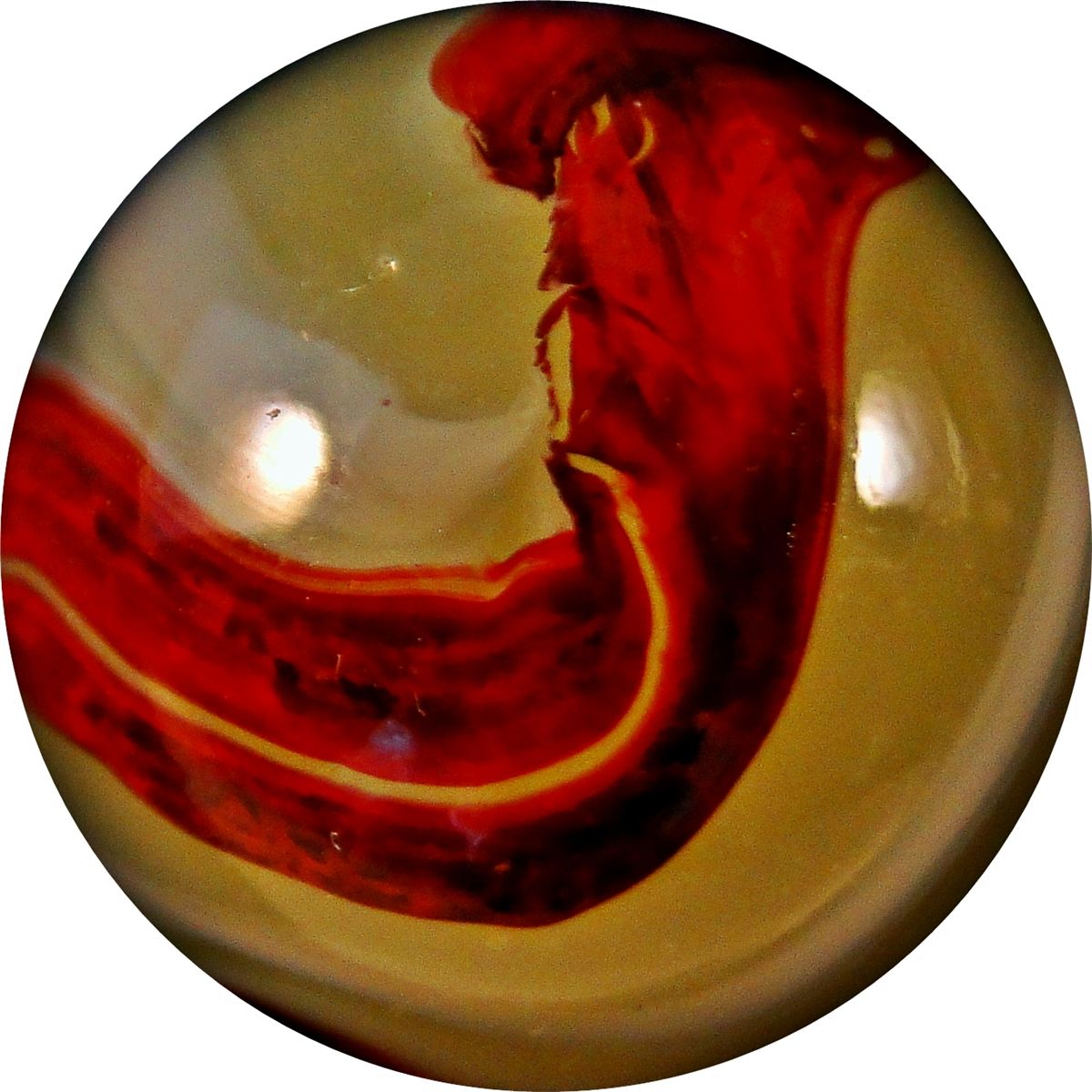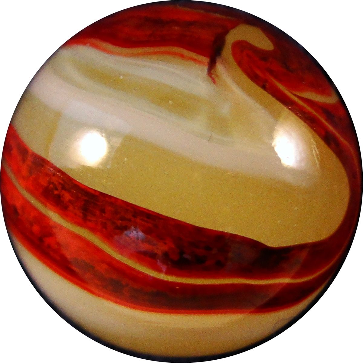 Very pretty Lemonade Oxblood. Nice oxblood corkscrew on fluorescent lemonade base, with a wispy white corkscrew next to it. One tiny sparkle. Clarksburg WV, circa 1927-1935. 5/8". Mint(-) (9.1).