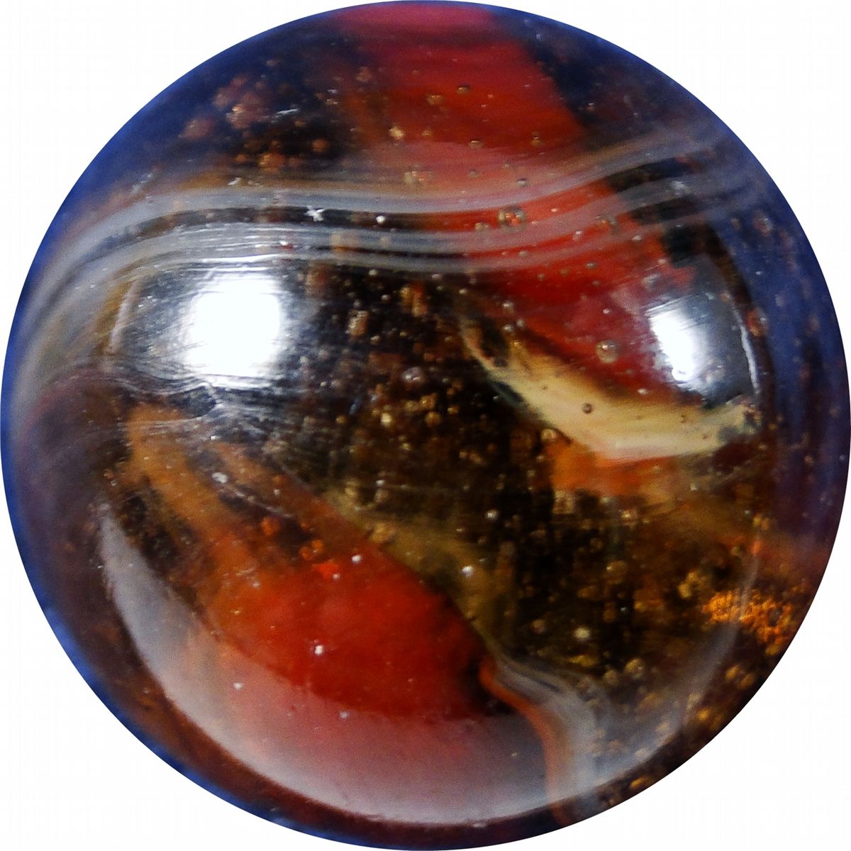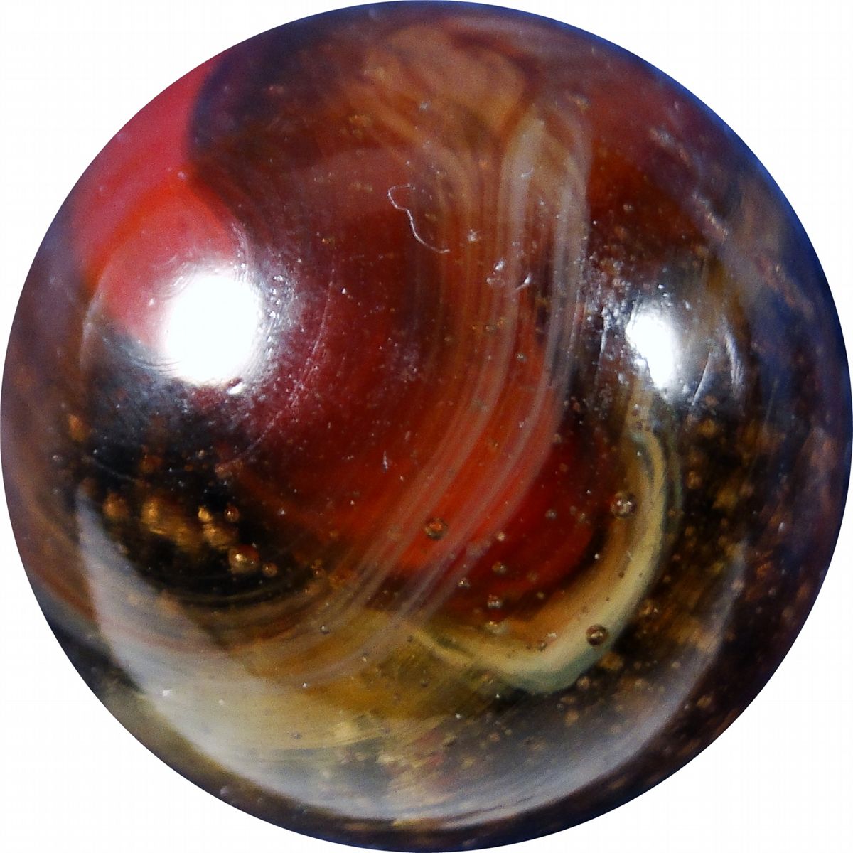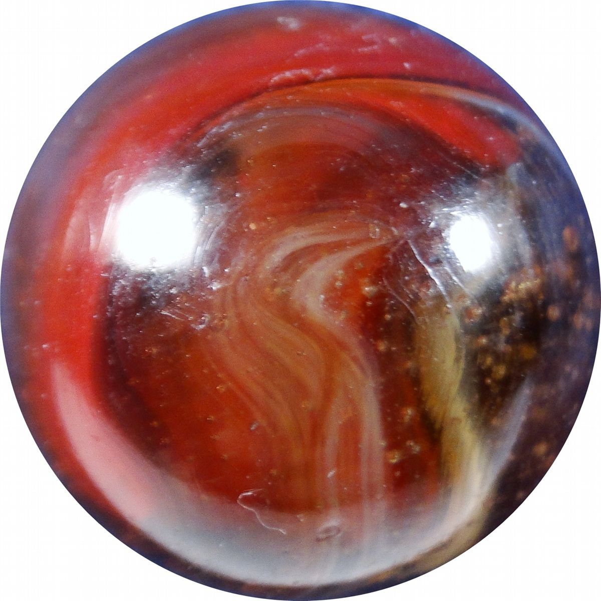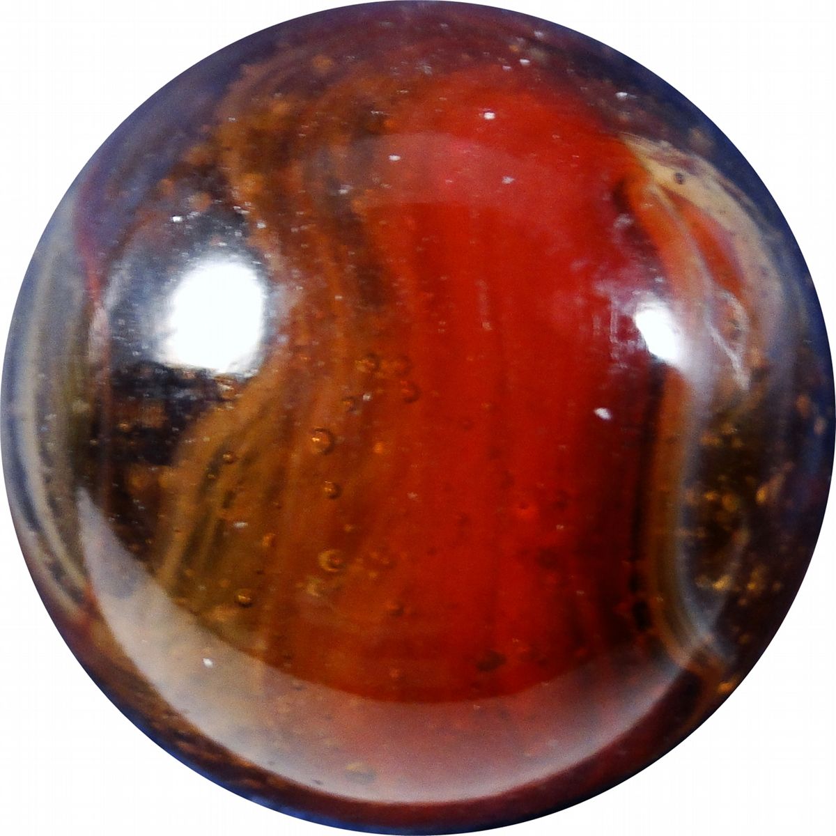 AKRO AGATE COMPANY, Experimental. This is one of the experimental patches sold by Roger Hardy about 15 years ago. Called an experimental oxblood, but not really oxblood. Transparent brown tinted bubble filled base. Swirl of red with white and brown throughout the marble. Clarksburg WV, circa 1922-1927. 25/32". Mint (9.8).