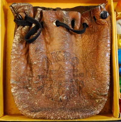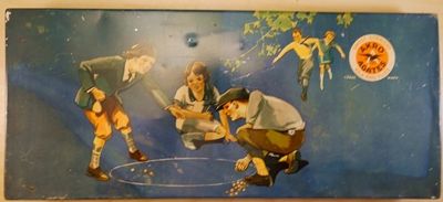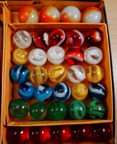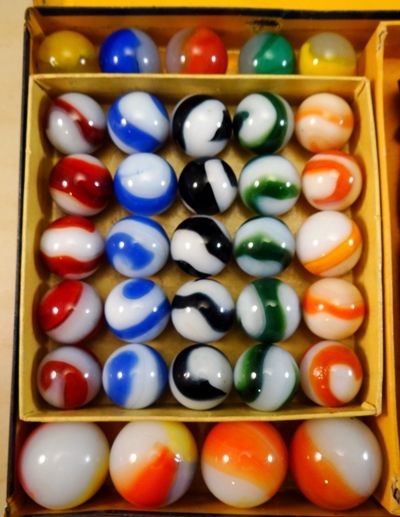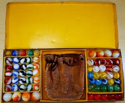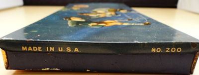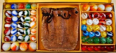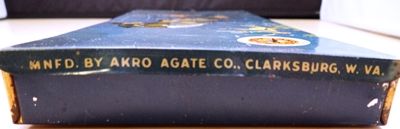 AKRO AGATE COMPANY, Original package. An original Akro Agate Company No. 200 tin. Contains the original trays. The marbles are correct for the box, but may not be original. The bag is an Akro Agate bag, but not the type you typically find in these tins. I have not seen this particular bag before, it is very rare. The tin is in nice shape. Some small faded areas on the top, but no significant scratches or rust. The trays are original, but have some split corners. The box contains fifty (50) 5/8" Prize Name and Snake corkscrews (25 of each). There are five (5) shooter Royal patches and five (5) shooter clearies. Also four (4) large Tricolors and four (4) large two-color patches. The bag has been used. The tin is Near Mint(+), the marbles are all Mint, the bag is Nea Mint(-). A nice set.