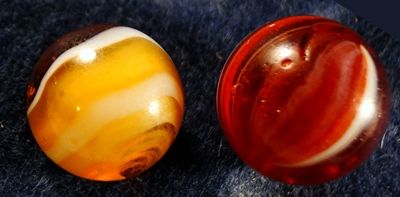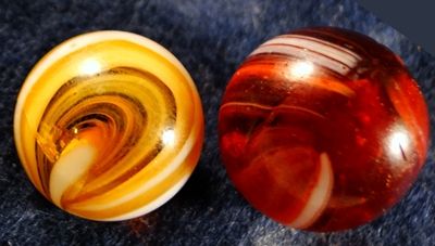 Lot 163. OTHER MACHINE MADE, Foreign. Lot of two (2) marbles. Pair of German machine mades. First is a slag with a diaper fold design. Annealing fracture. 21/32". Near Mint(+) (8.9). Second is a striped transparent. 23/32". Mint(-) (9.0). German, probably 1950-1970.