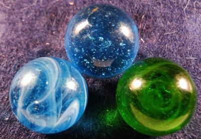 Lot 173. TRANSITIONAL, Ground. Lot of three marbles. All are handgathered slags. Ground pontils. Assorted colors. Very nice. Germany, circa 1850-1920. 13/16". Mint (9.9) and Mint(-) (9.0. One is Mint(-).