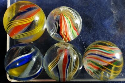 Lot 179. SWIRL, Solid Core. Lot of five (5) marbles. All are Solid Core Swirls. Three are three-layer, one is lobed. 3/4" to 7/8". 1 Mint (9.9), 2 (Mint(-) (9.0), 2 Near Mint(+) (8.8).