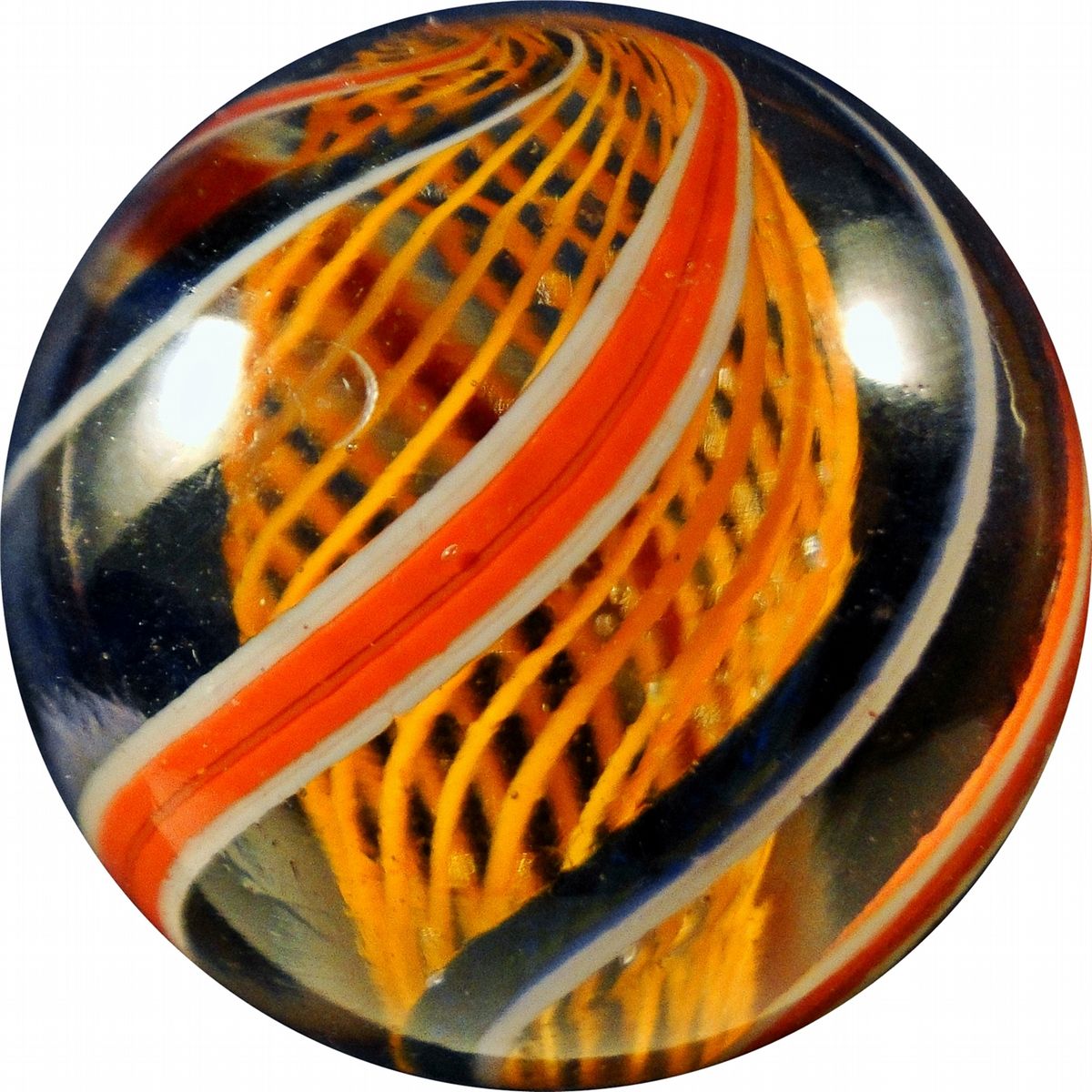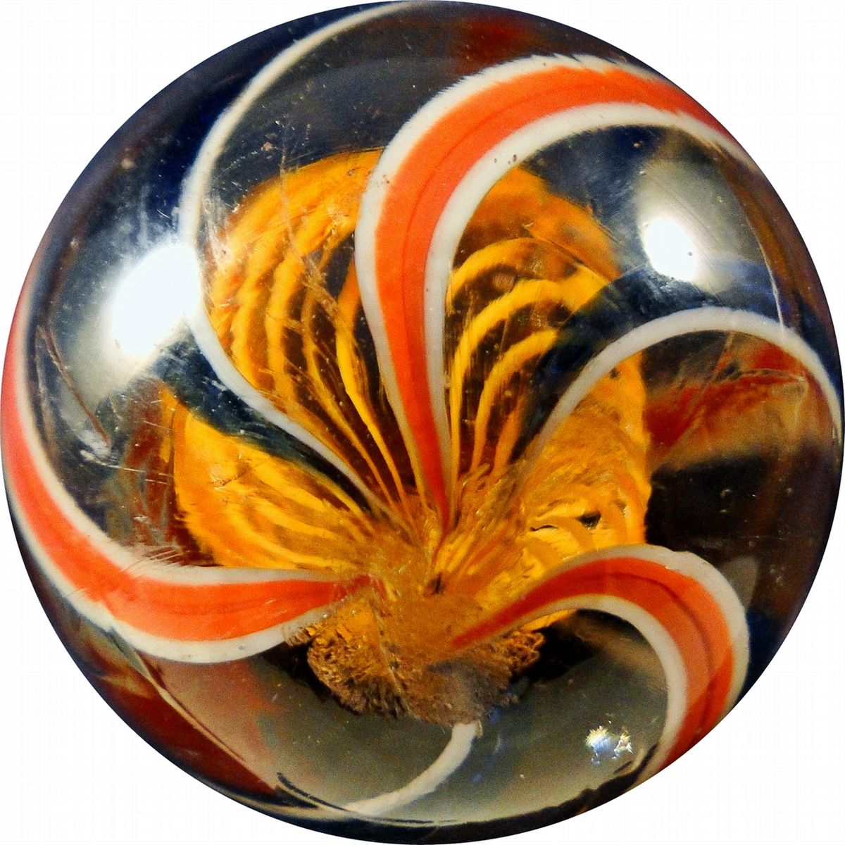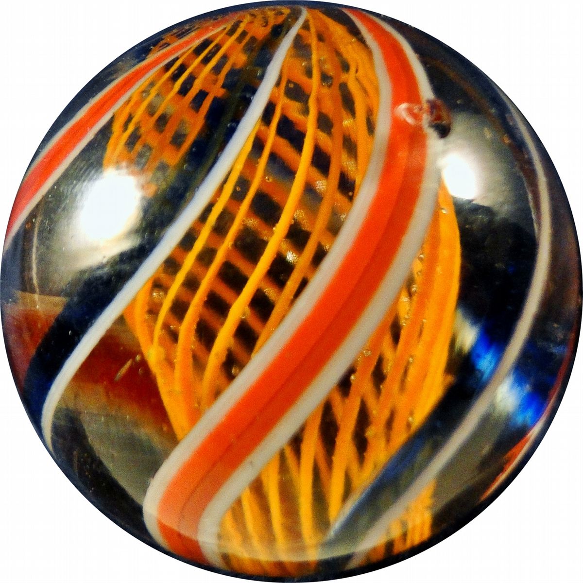 Lot 19. SWIRL, Latticinio Core. Rare Orange Latticinio Core Swirl. Very large example. Nicely constructed. A real beauty. Has one tiny chip and two tiny subsurface moons. Still, looks great. Germany, circa 1870-1920. 1-9/16". Near Mint(+) (8.7). Estimate: $150-$300