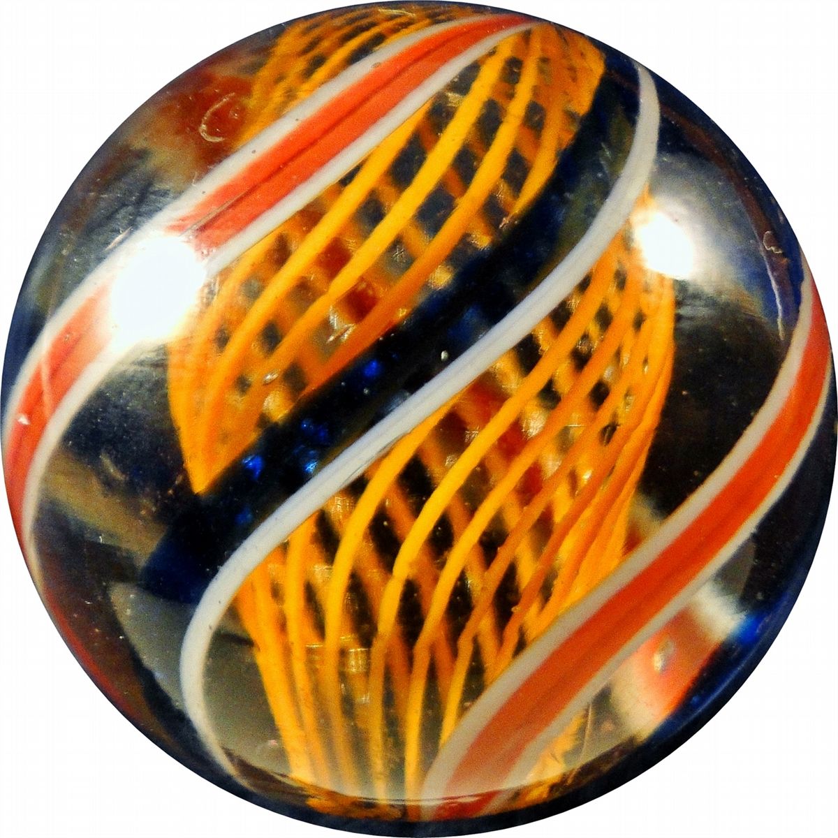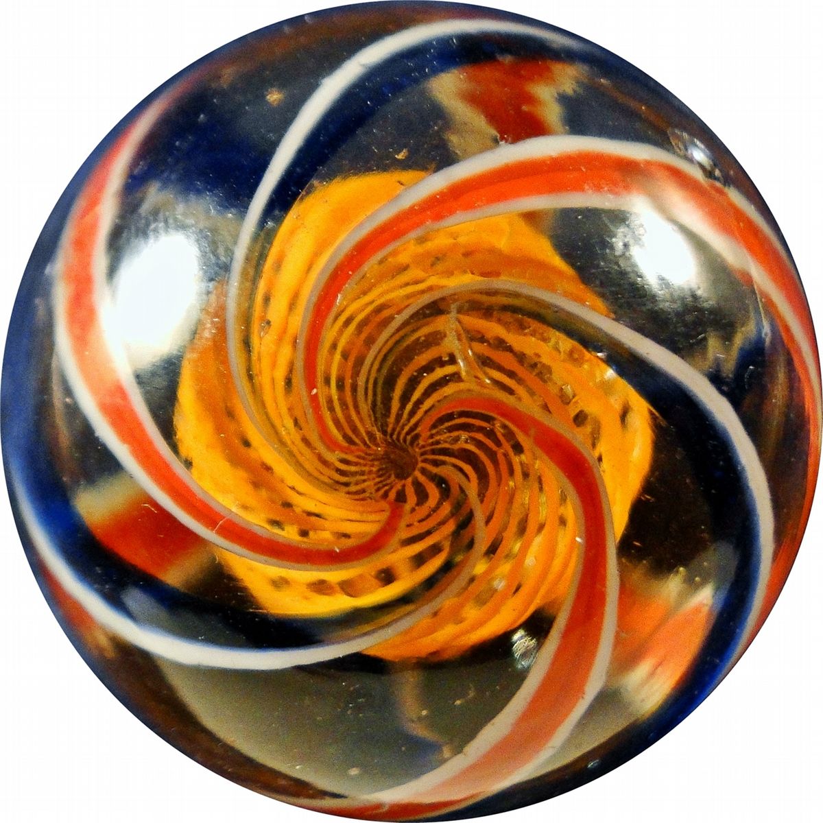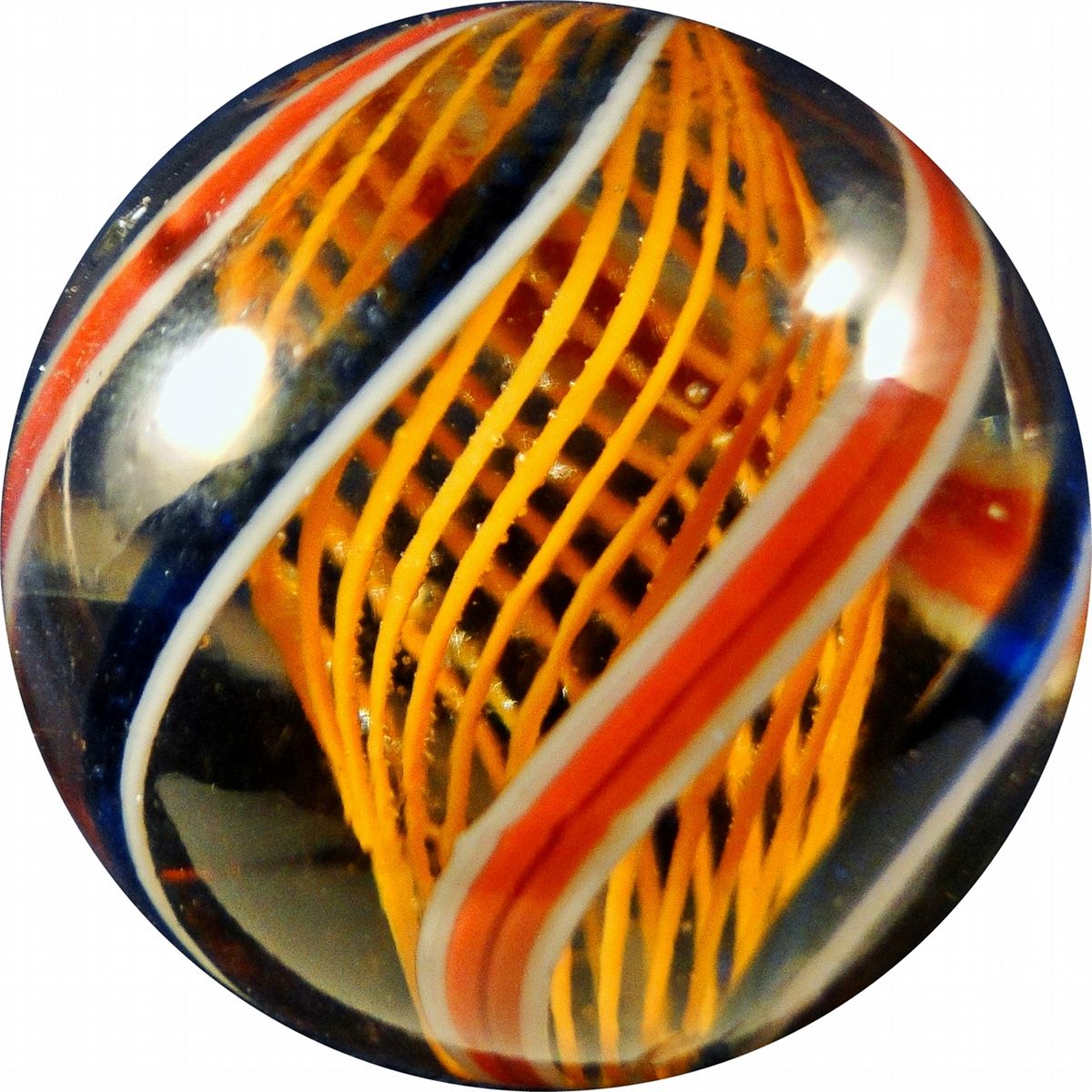 Lot 19. SWIRL, Latticinio Core. Rare Orange Latticinio Core Swirl. Very large example. Nicely constructed. A real beauty. Has one tiny chip and two tiny subsurface moons. Still, looks great. Germany, circa 1870-1920. 1-9/16". Near Mint(+) (8.7). Estimate: $150-$300