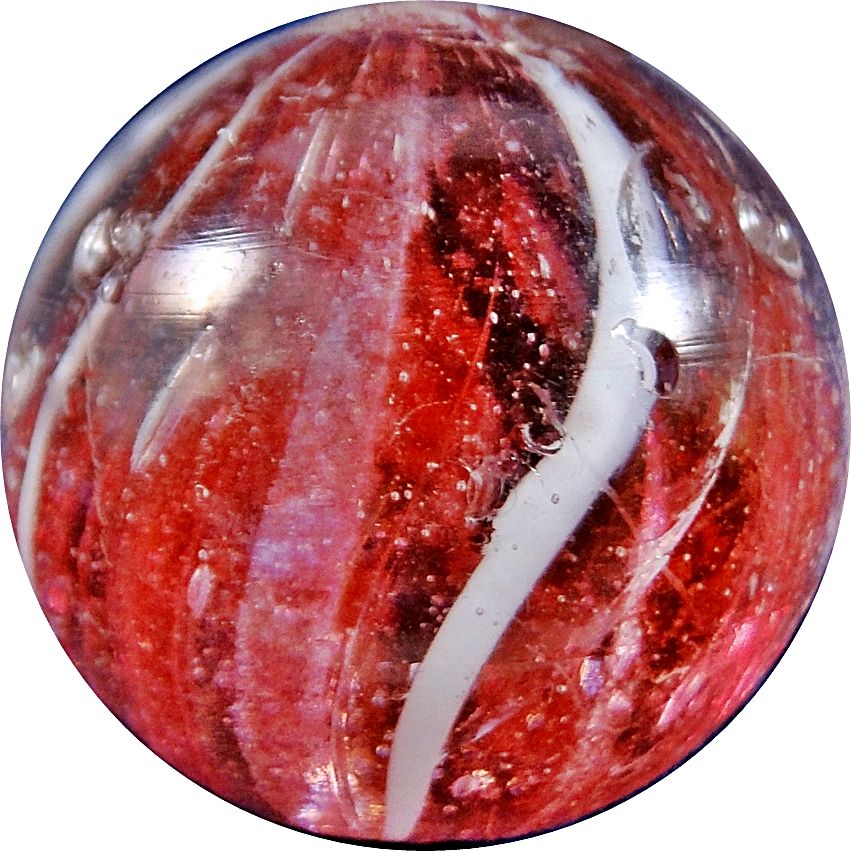 OTHER HANDMADE, Mist. Interesting large marble. Transparent clear base. Core is a ghost core of seed air bubbles. Middle layer is a Mist of transparent pink stretched bands. Outer layer is white bands. One large chip and a number of tiny chips. Germany, circa 1870-1920. 1-1/16". Good (7.6). Provenance: ex-collection Joe Rocco. Estimate: $40-$80