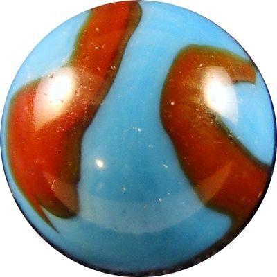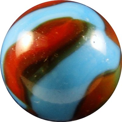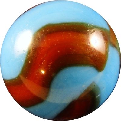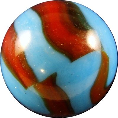 Lot 22. PELTIER GLASS COMPANY, National Line Rainbo. Four-ribbon two-color National Line Rainbo. Reddish brown ribbons on light blue. Beauty. Ottawa IL, circa 1930-1940. 19/32". Mint (9.7).