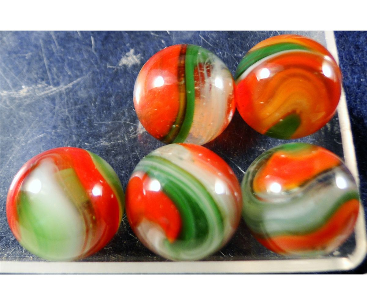 Marbles: Lot 24. 5 Red/Green Popeye Corkscrews. 5/8" to 21/32". Mint 9.7 to 9.8