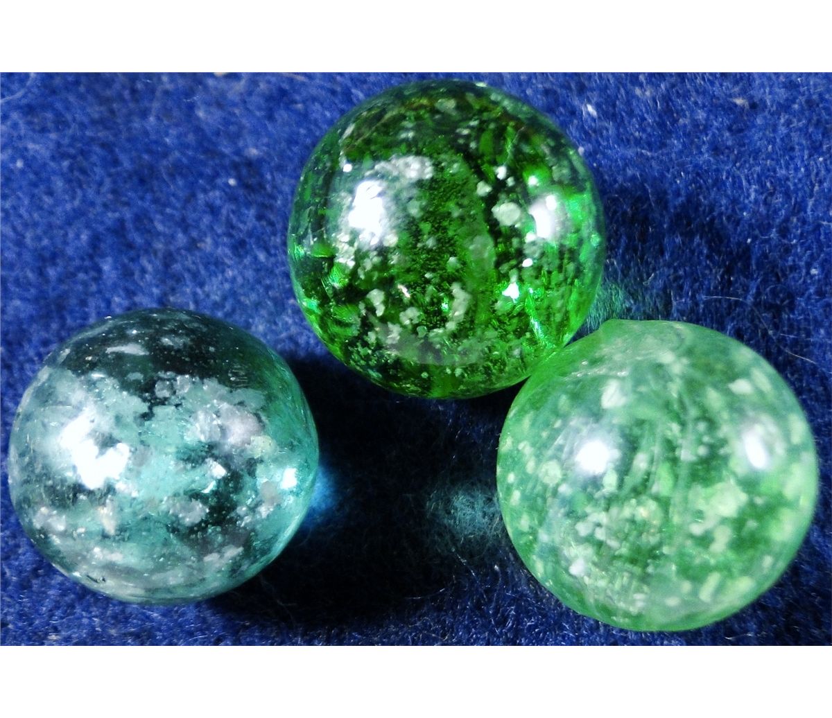 OTHER HANDMADE, Mica. Lot of three marbles. All are Green Micas. One is actually a green clearie with lots of white sand it. That one is 11/16" & Mint (9.7). Other two Micas. Both 21/32". One Mint (9.8). Other Near Mint(-) (8.2).