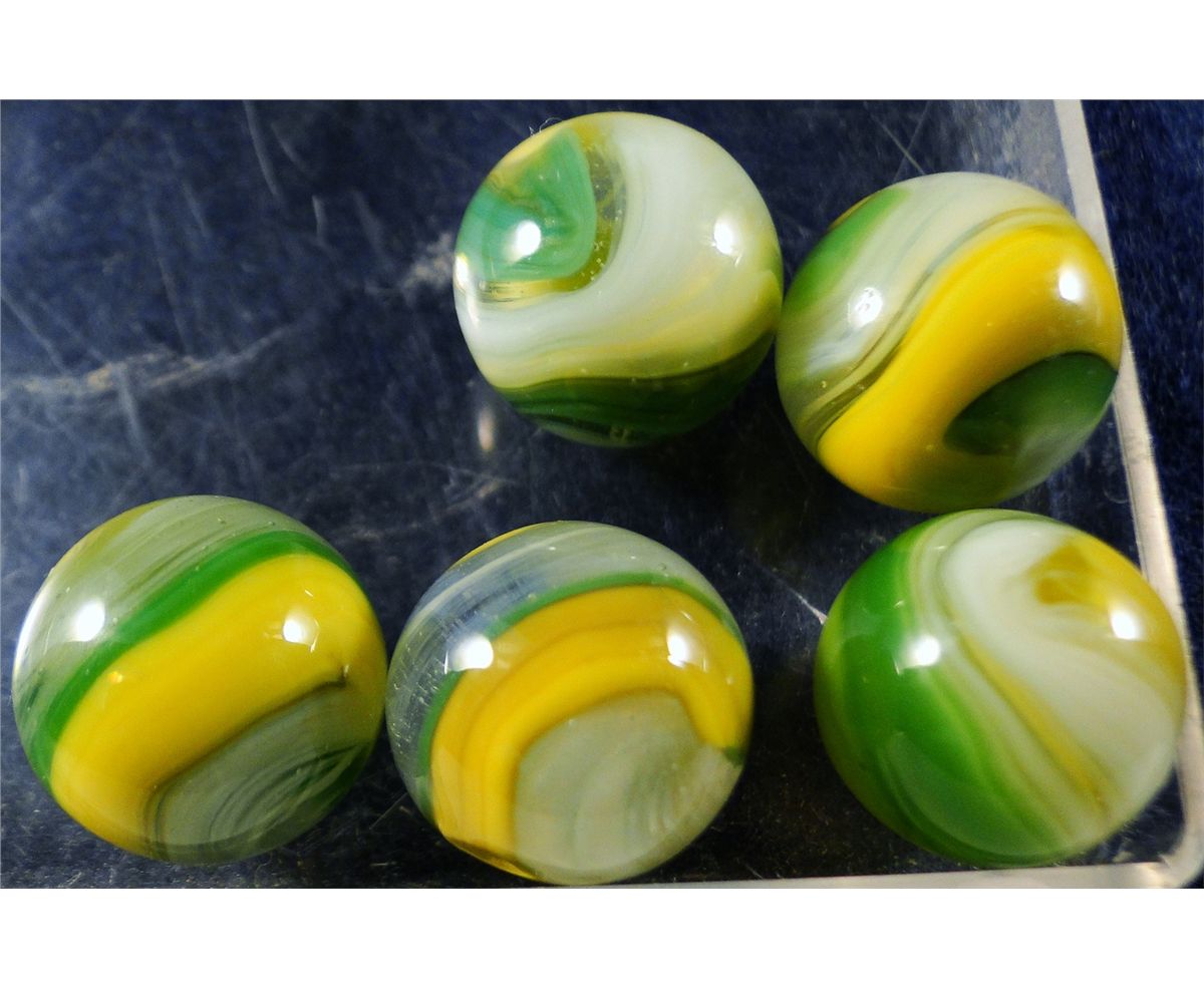 Marbles: Lot 26. 5 Green/Yellow Popeye Corkscrews. 5/8" to 21/32". Mint 9.7 to 9.8