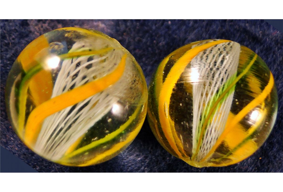 Lot of two marbles. Matched pair of white Latticinio Core Swirls. Very nice. Germany, circa 1870-1920. 13/16". Mint (9.8).