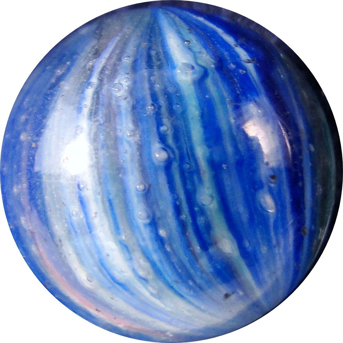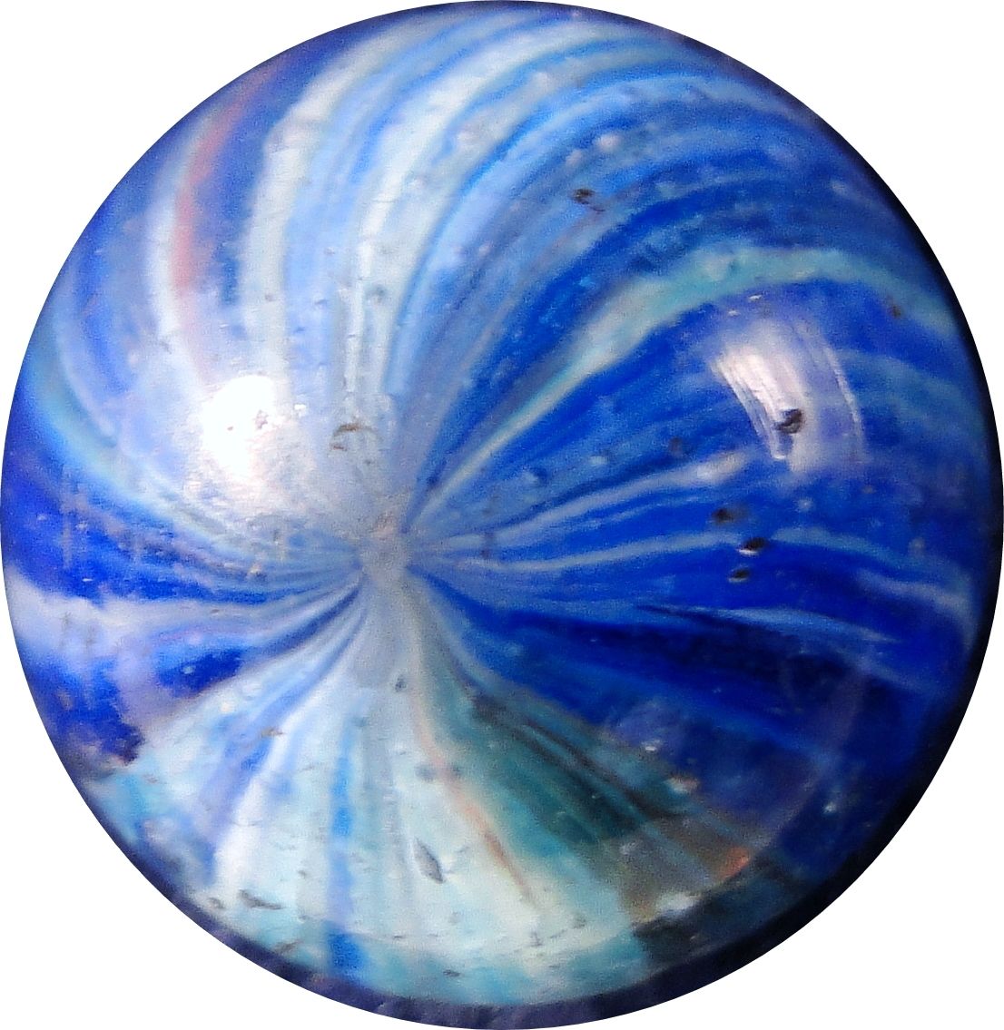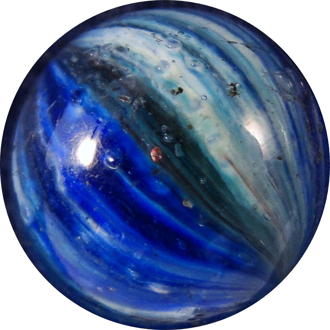 Four-panel Onionskin, with a few flakes of mica. Two panels are blue on white, two are turquoise on white. Pretty. Germany, circa 1870-1920. 21/32". Mint (9.8).