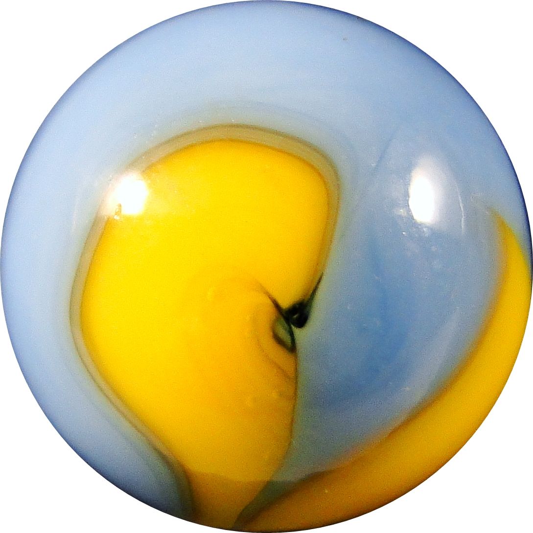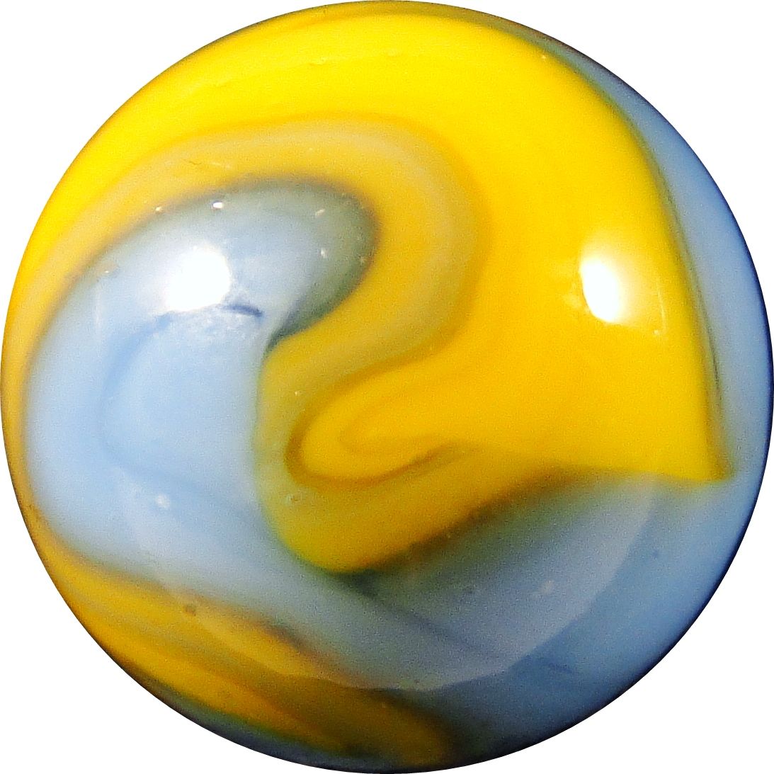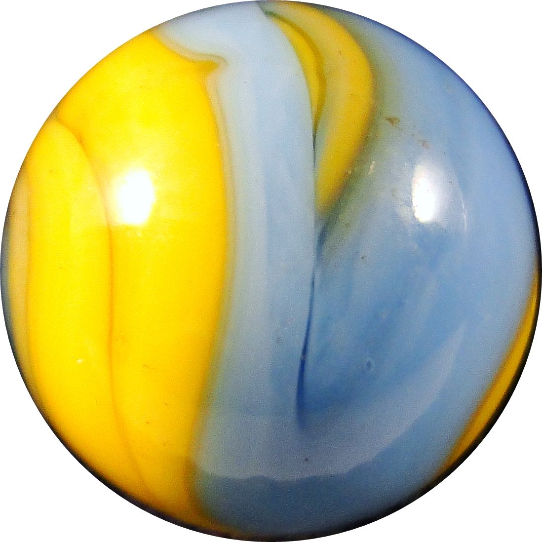 ALLEY COMPANIES, Swirl. Yellow swirls on light blue. Pennsboro WV, circa 1930-1935. 19/32". Mint (9.8).