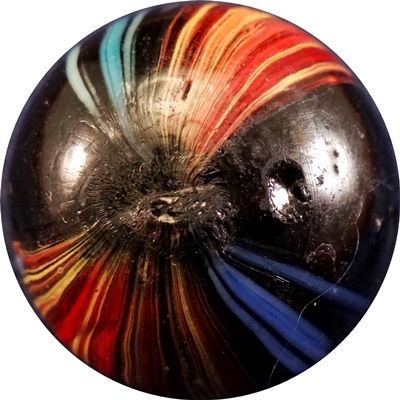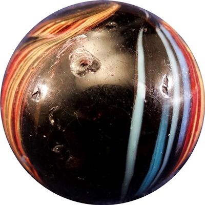 OTHER HANDMADE, Indian. Shooter Indian. Opaque black base. Six-panel Indian. Two panels of stretched pink and yellow, two panels of stretched blue and white, two empty panels. Several small moons and subsurface moons, predominately on the empty panels. Germany, circa 1870-1920. 15/16". Good(+) (7.9). Provenance: ex-collection Joe Rocco.
