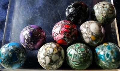 Lot 41. OTHER MACHINE MADE, . Lot of nine (9) marbles. Assorted "Dragon Eggs". These are crushes stone mixed with a resin and then ground to a sphere. I'm not sure what company made these, but they are likely from China. 3/4". Mint.