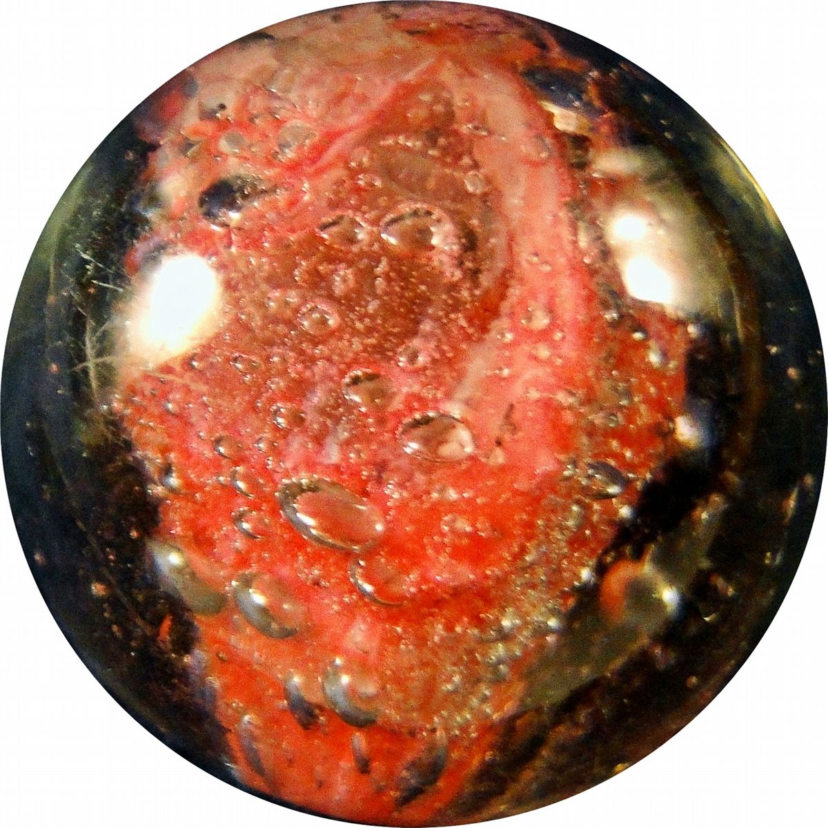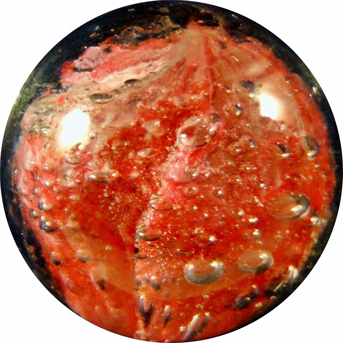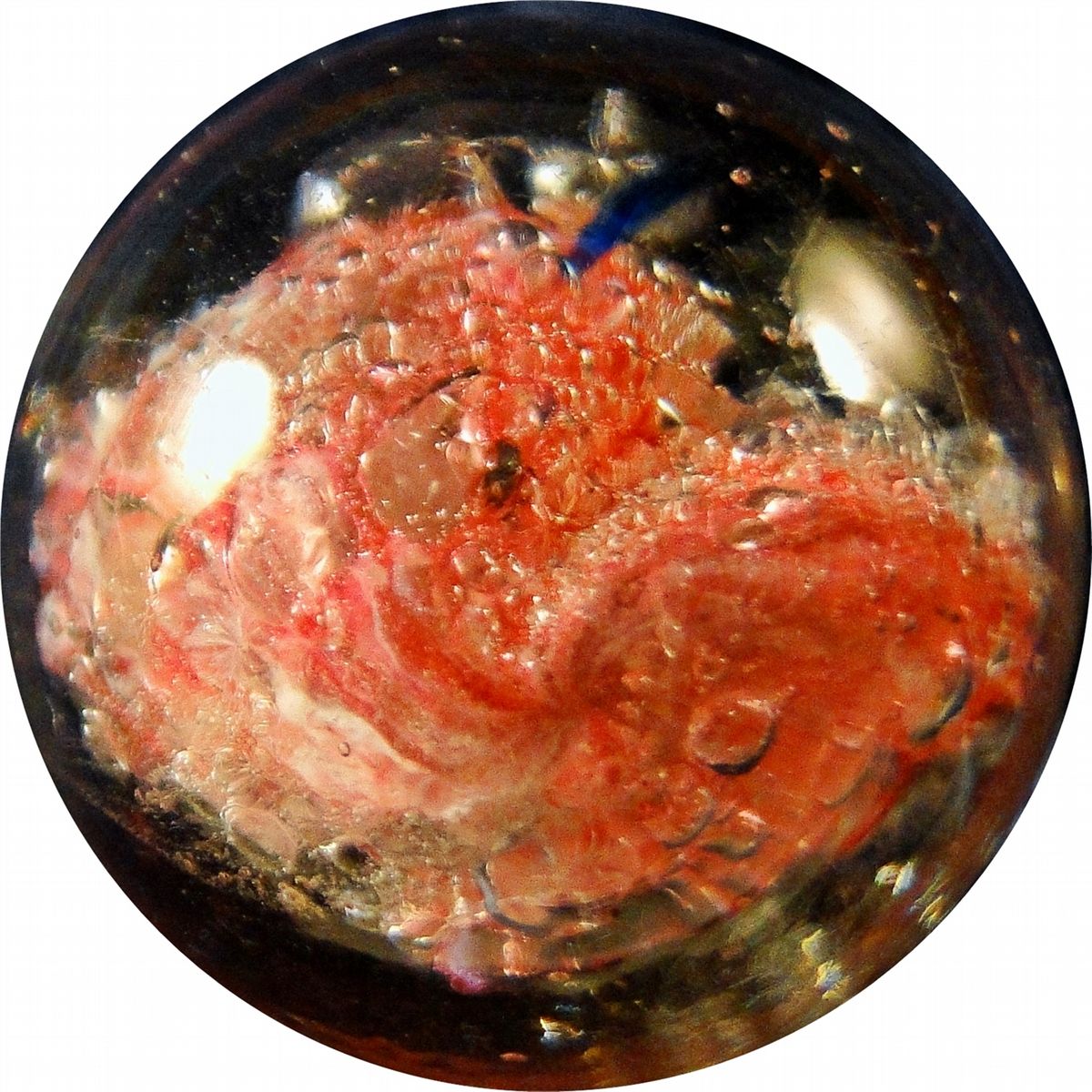 Lot 42. END OF DAY, Ribbon Onionskin. Very rare marble. Ribbon Onionskin. Core is sparse white, covered with transparent pink, suffused with air bubbles. Nice flattened ribbon. Lobe on either side. One stray stretched fleck of blue on the surface. Very rare. Germany, circa 1870-1920. 27/32". Mint (9.9). Estimate: $450-$900