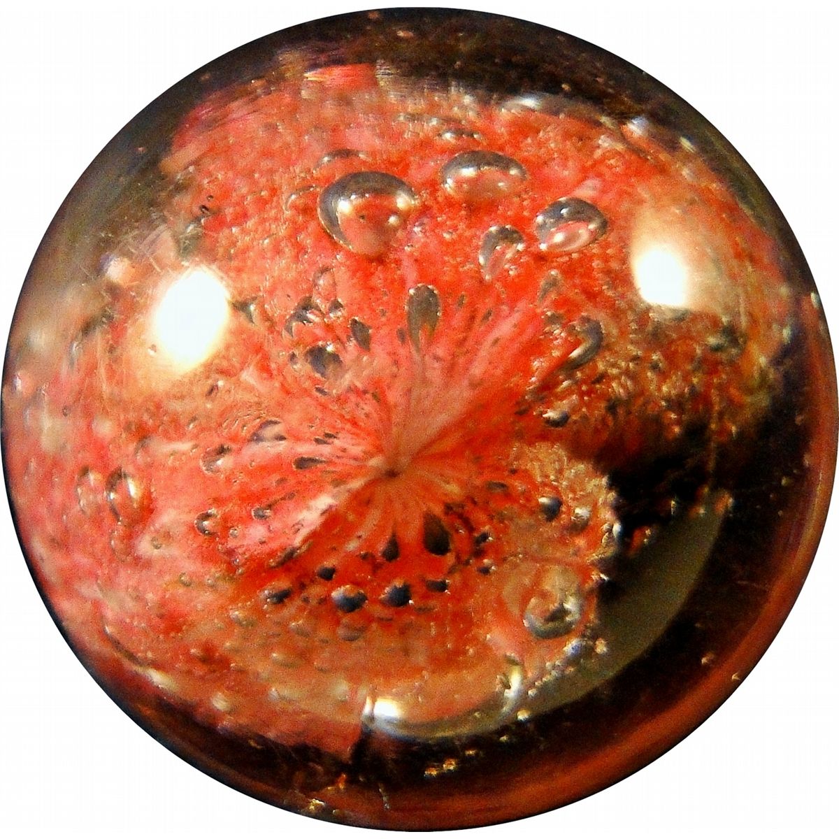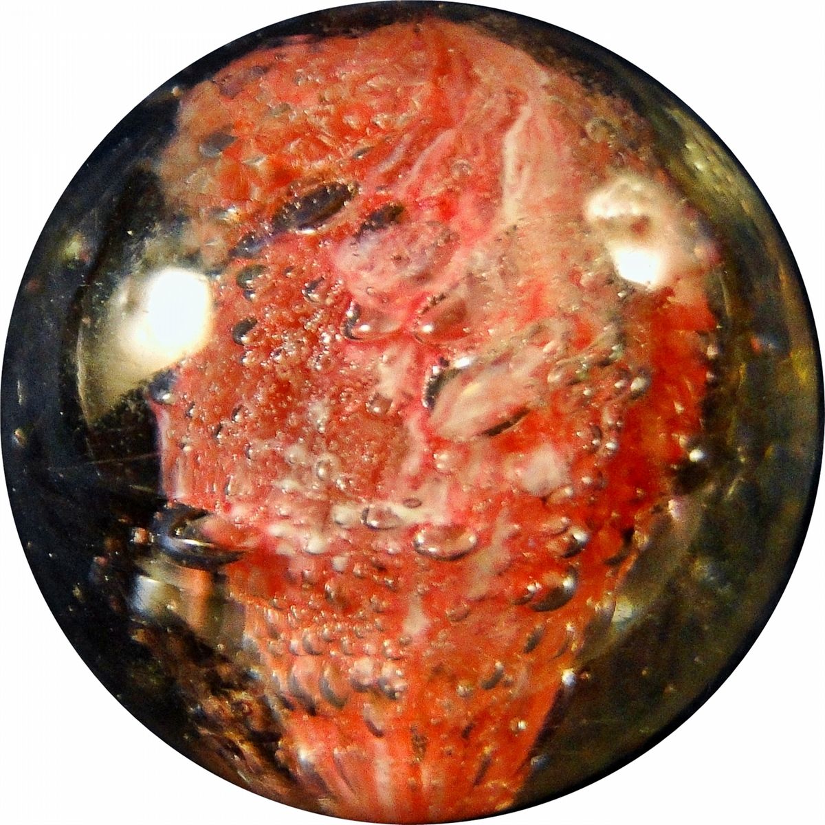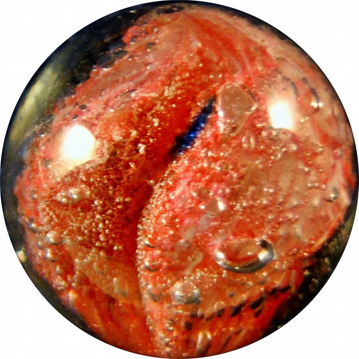 Lot 42. END OF DAY, Ribbon Onionskin. Very rare marble. Ribbon Onionskin. Core is sparse white, covered with transparent pink, suffused with air bubbles. Nice flattened ribbon. Lobe on either side. One stray stretched fleck of blue on the surface. Very rare. Germany, circa 1870-1920. 27/32". Mint (9.9). Estimate: $450-$900