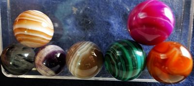 Lot 44. MISCELLANEOUS, Mineral. Lot of seven (7) marbles. Four are dyed agates, one malachite, one amethyst, one rutilated quartz. All are modern, machine ground. 5/8" to 25/32". Mint.