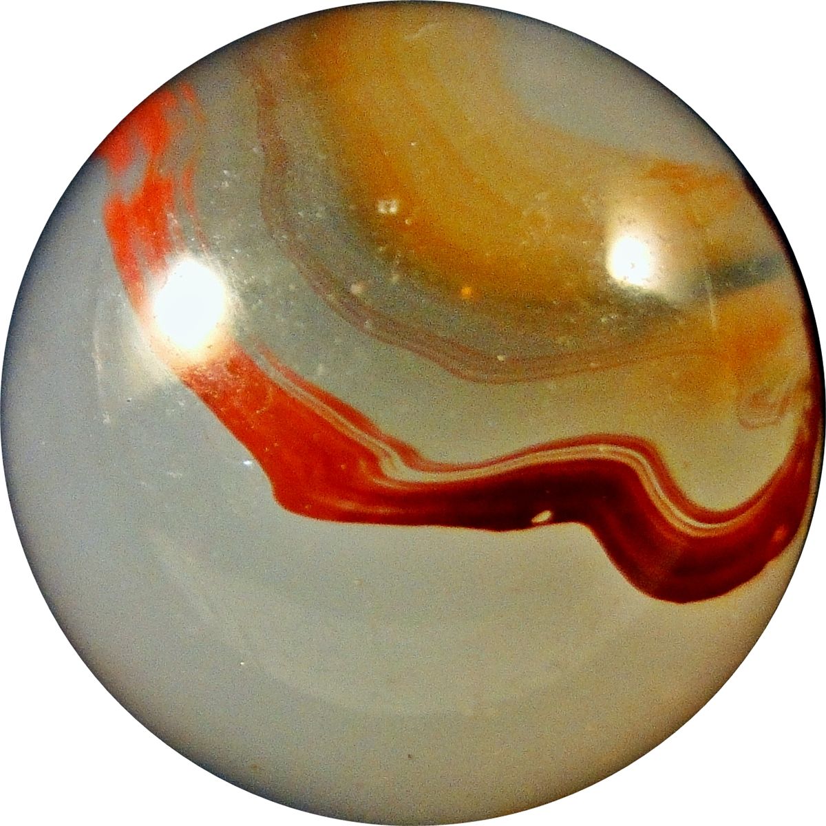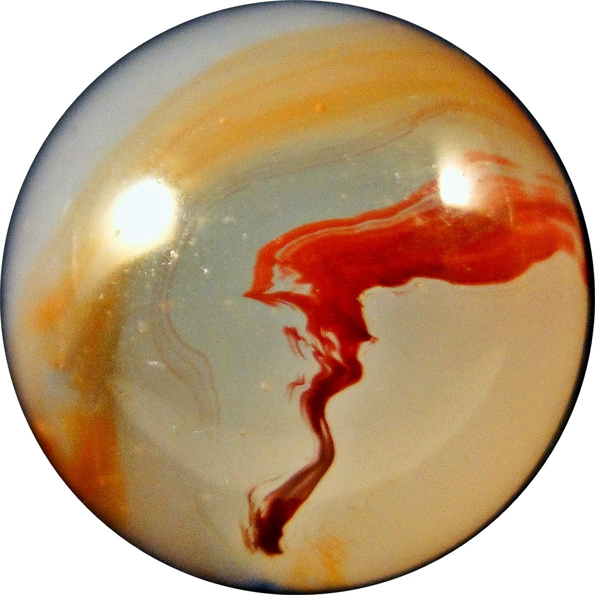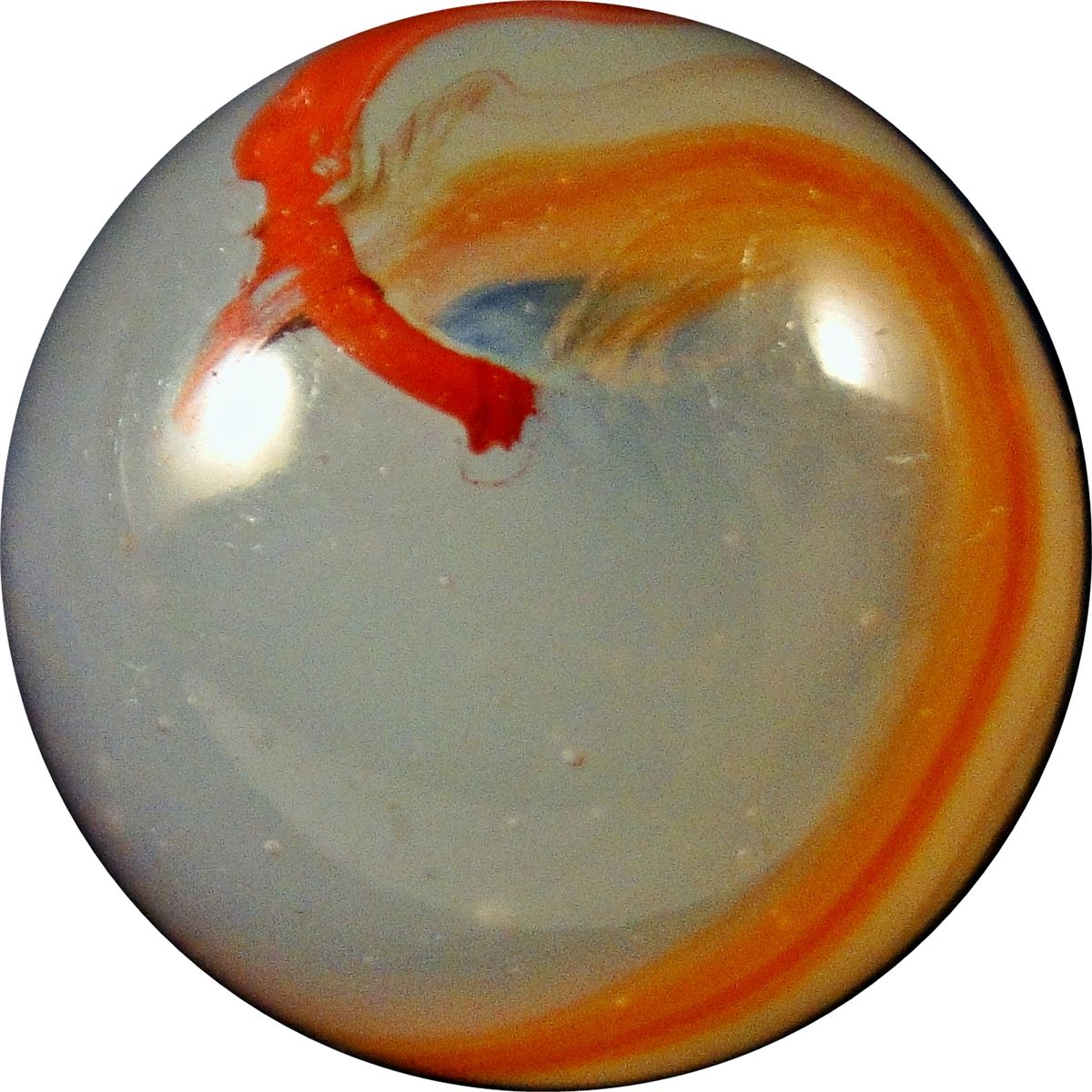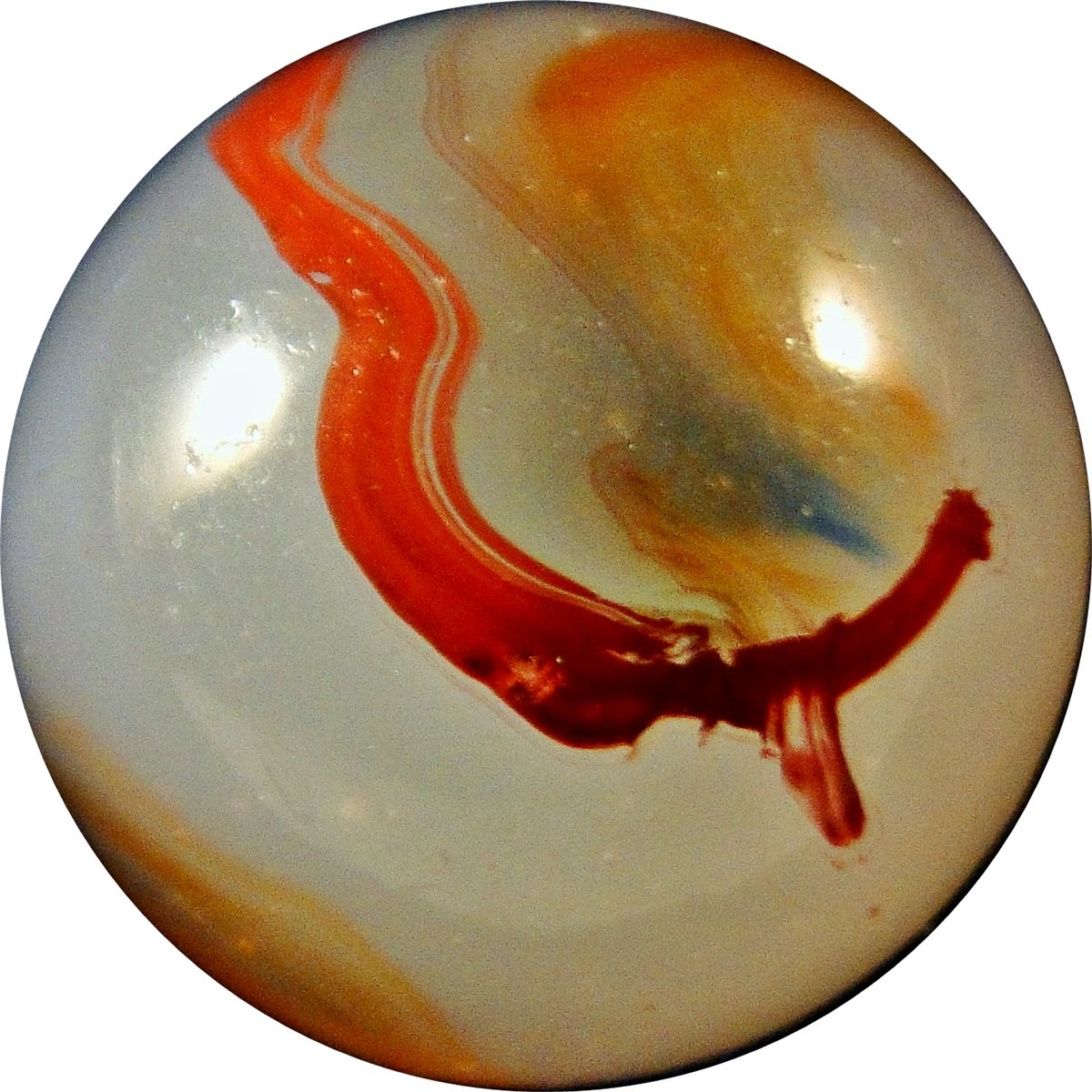 Lot 45. AKRO AGATE COMPANY, Hybrid Oxblood. Rare Blue/Carnelian Hybrid Oxblood. Milky white base. Spiral of translucent brown and spiral of translucent blue, with a spiral of oxblood. One tiny sparkle. Clarksburg WV, circa 1925-1935. 5/8". Mint(-) (9.1). Estimate: $125-$250
