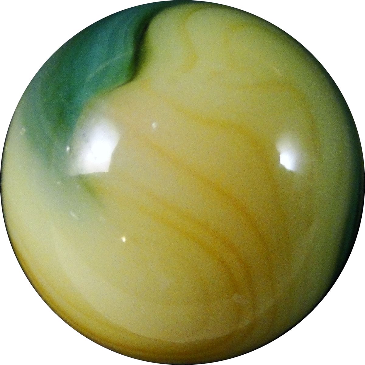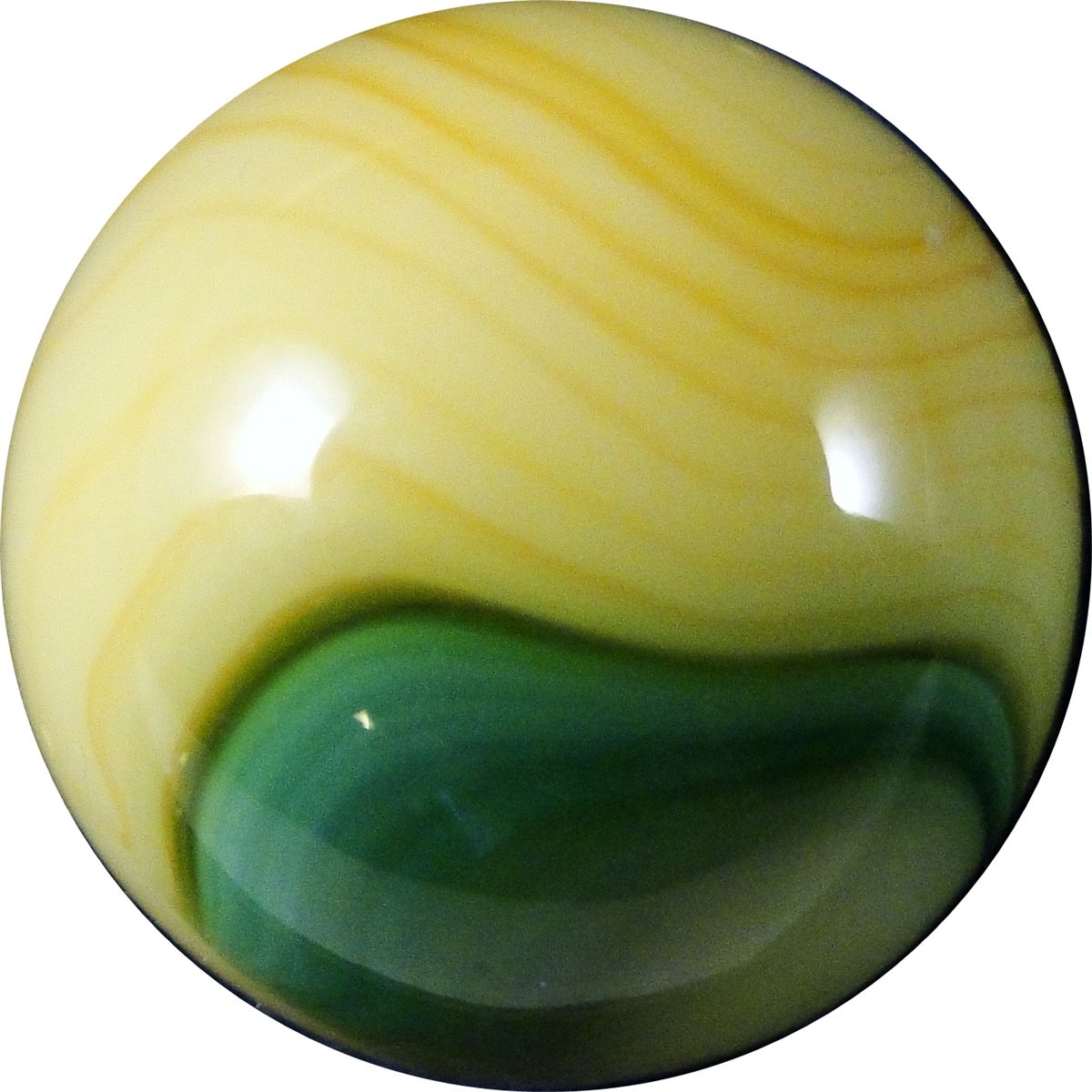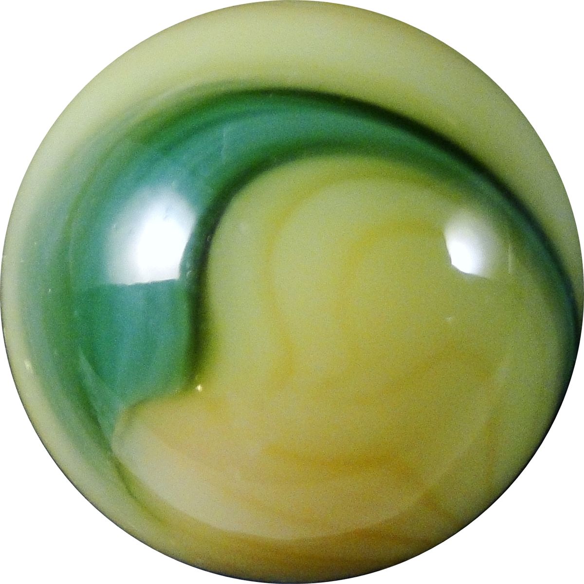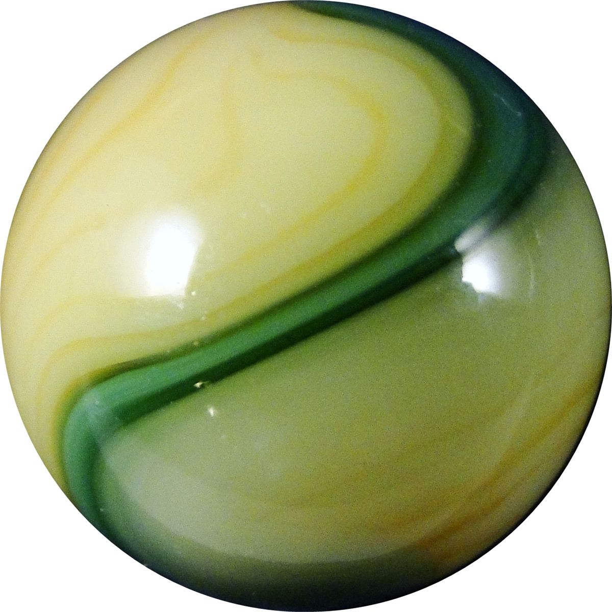 AKRO AGATE COMPANY, Corkscrew. Spiral of green in creamy yellow. One very tiny sparkle. Clarksburg WV, circa 1925-1935. 5/8". Mint(-) (9.2).