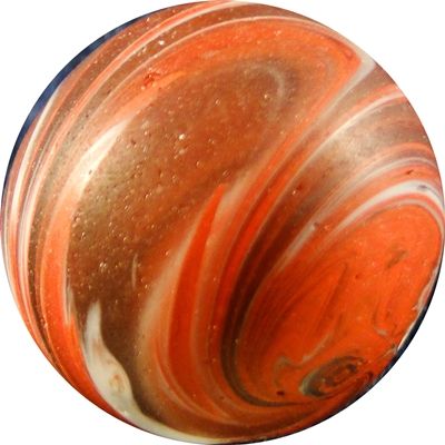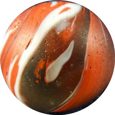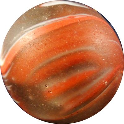 Lot 49. TRANSITIONAL, Oxblood. German single-pontil handgathered Oxblood transitional. Oxblood, swirled with white and clear. The marble was recovered from a shipwreck and the surface was abraded by sand and salt water, so it has an "acid" type wash finish to it. The ground pontil is gone. Technically, this is "sea glass" now. Germany, circa 1860-1910. 27/32". Polished (by wave action).Provenance: This marble was recovered from an unnamed Long Island shipwreck and is accompanied by a Certificate of Authenticity from Land of Marbles.
