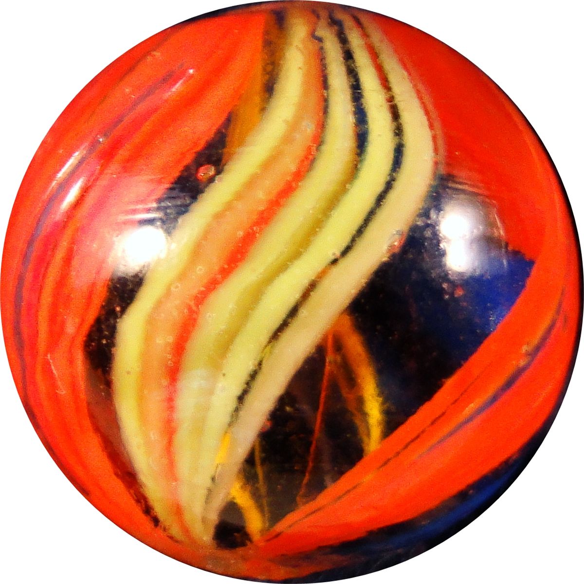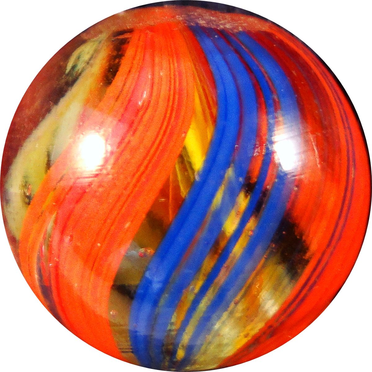 Fascinating four-panel Joseph Coat. Clear base. Yellow strands in the core. Outer layer is about eighty percent color. Four panels. Two are stretched orangish red. One is blue. One is light green. Germany, circa 1870-1920. 9/16". Mint (9.8).