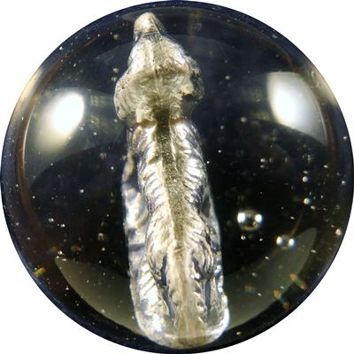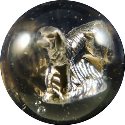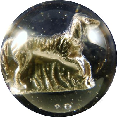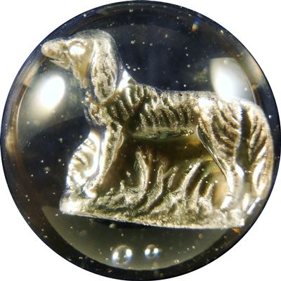 Lot 63. SULPHIDE. Figure is a running dog. Exceptional detail to the figure. Silvering on the sulphide figure, but no air bubbles. Set slightly off-center. Polished. From a shipwreck. Germany, circa 1850-1920. 1-1/2". Polished. Provenance: This marble was recovered from an unnamed Long Island shipwreck and is accompanied by a Certificate of Authenticity from Land of Marbles.