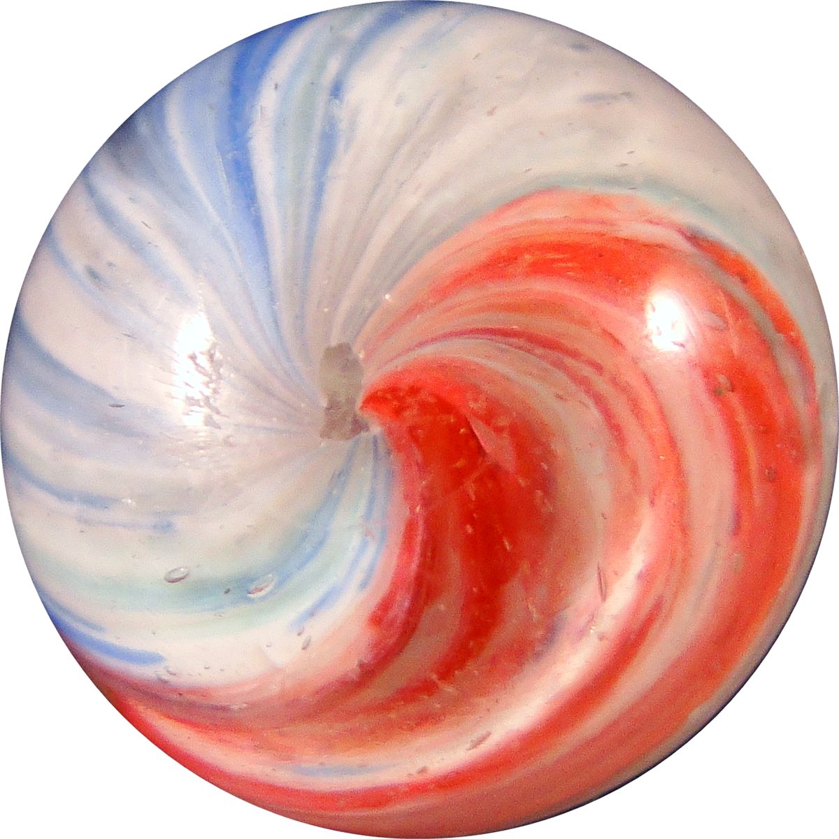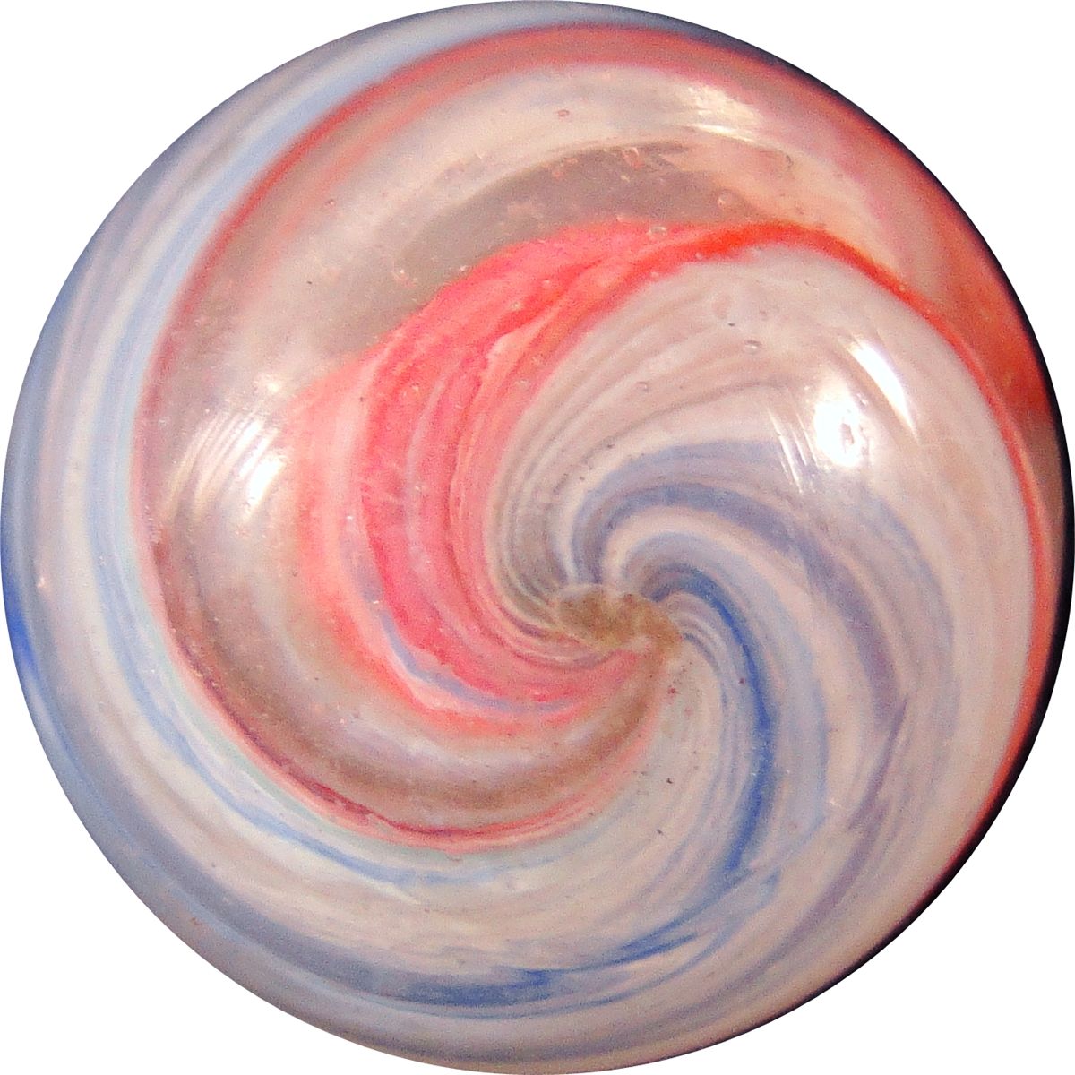 Hard to find Two-Panel Onionskin. Opaque white core. One panel is blue, one is pink. The pink has a deep lobe in it. One manufacturing dimple on it. Germany, circa 1870-1920. 5/8". Mint (9.5).