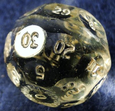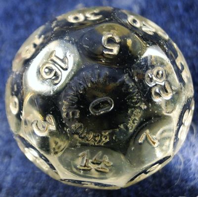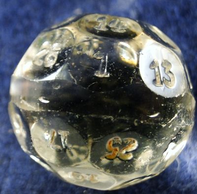 Lot 72. MISCELLANEOUS, Fortune Telling Marble. Glass fortune telling marble. Made in a mold and then the seam is ground down. Thirty two (32) numbered facets on it. Embossed "Made in Czechoslovakia". Czechoslovakia, circa 1920-1930. 1-1/16". Mint (9.9).