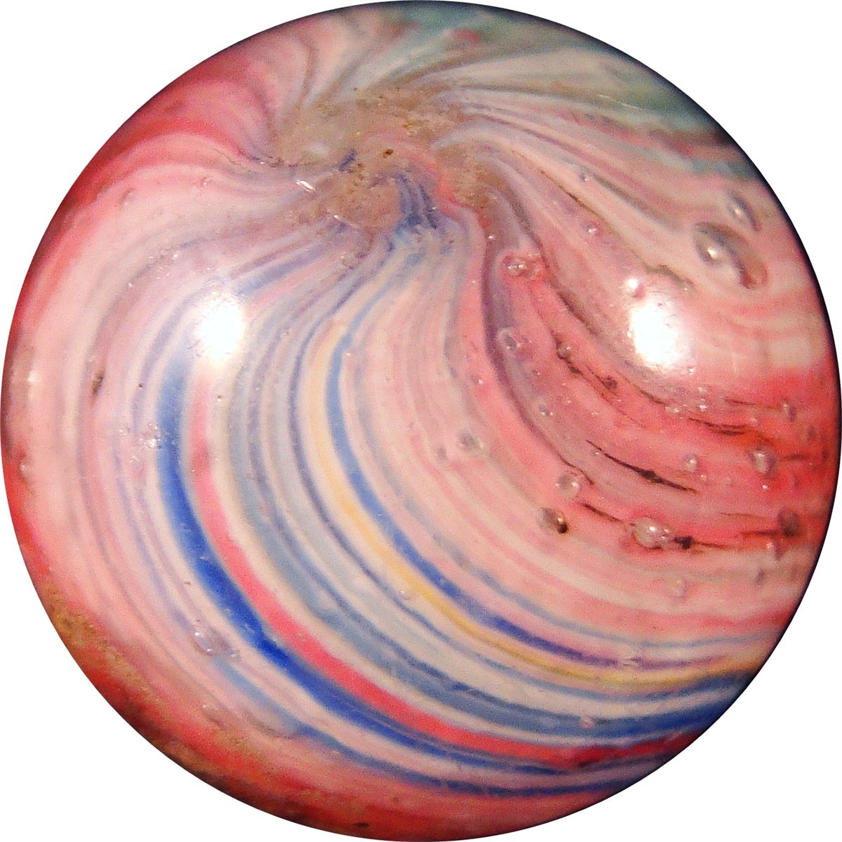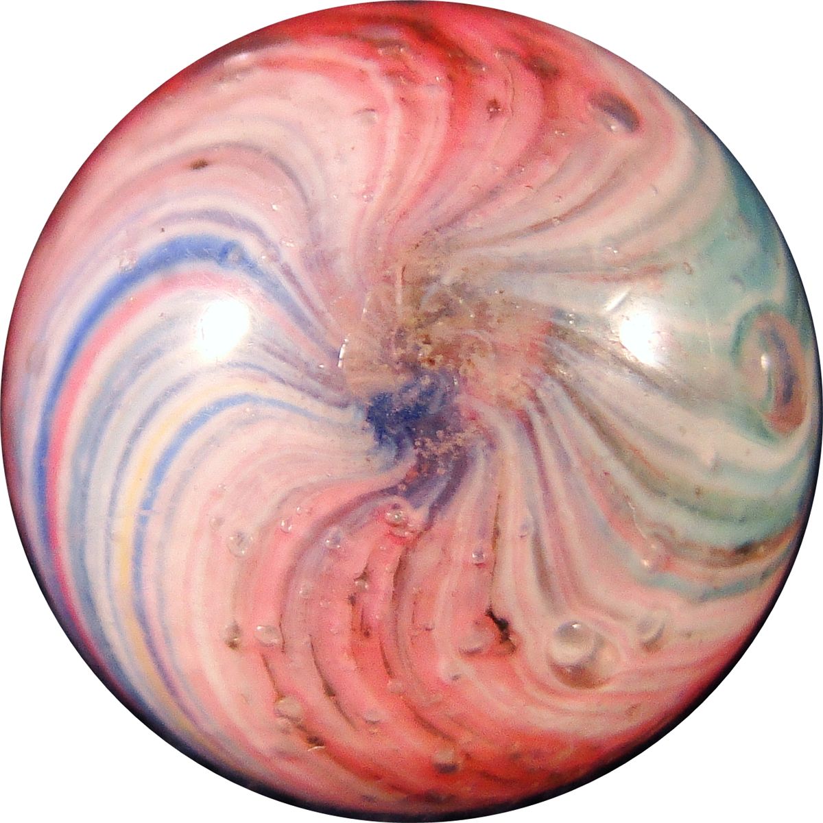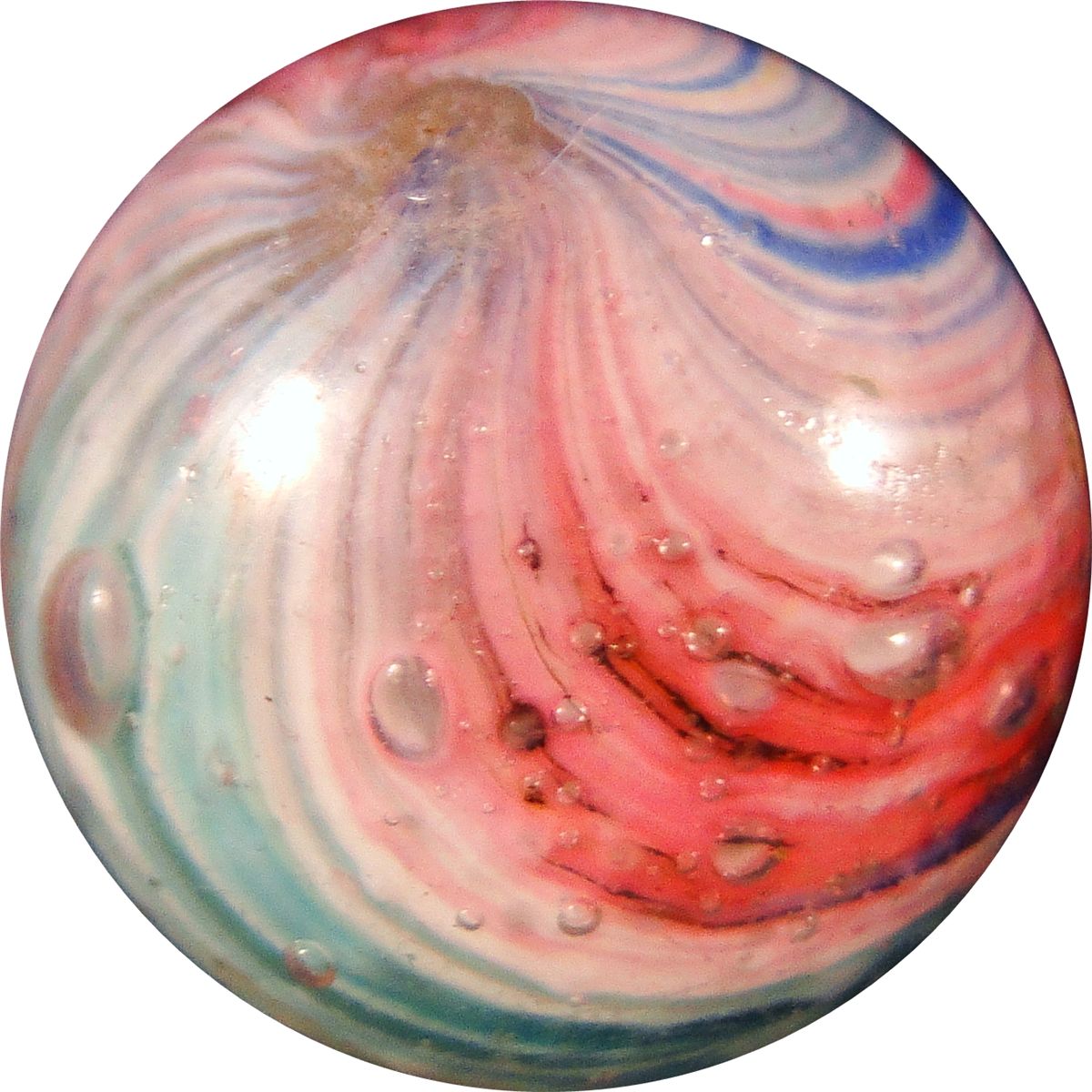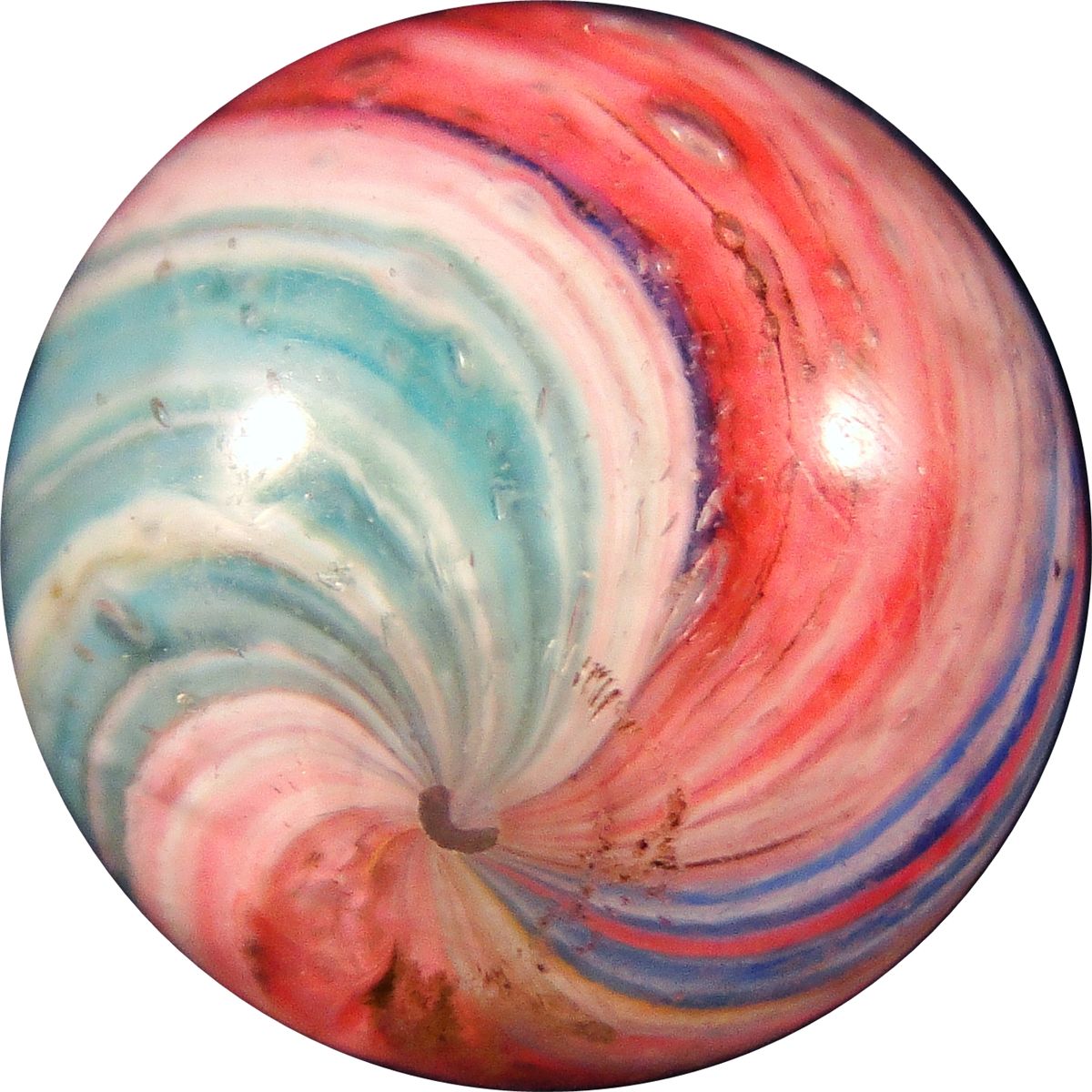 Very hard to find Lef-Hand Twist 4-Panel Onionskin. Stunning example, has a really pronounced left-twist. White core. Two panels of pink, one light blue, one light green. Two airholes, one dirt spot. Germany, circa 1870-1920. 21/32". Mint(-) (9.2).