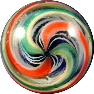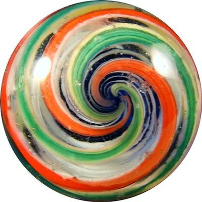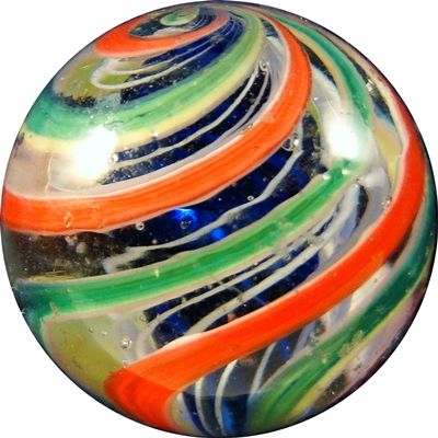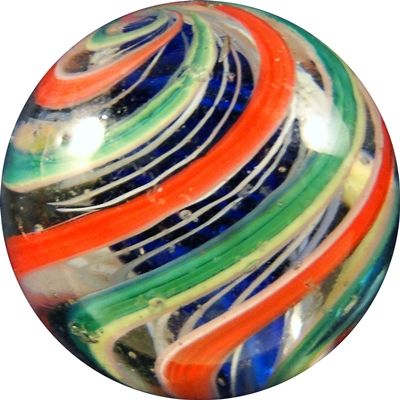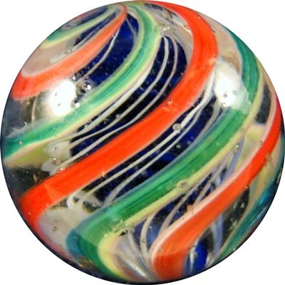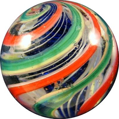 Lot 79. SWIRL, Solid Core. Extremely rare, shooter size, three-layer, Jelly Solid Core Swirl. Core is transparent blue. The outer layer is four bands of color. Between these two layers is a middle layer cage of white latticinio strands. The middle layer is between the two, it doesn't rest on the core. Exceptionally rare. There are some melt pits and some tiny damage pits on the surface. You have to look with a loupe to see them. I'll have to grade this less than Mint to be conservative, though it views much better. Germany, circa 1870-1920. 25/32". Near Mint(+) (8.9).