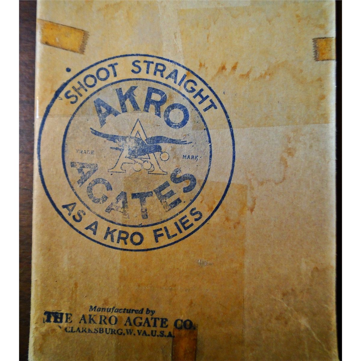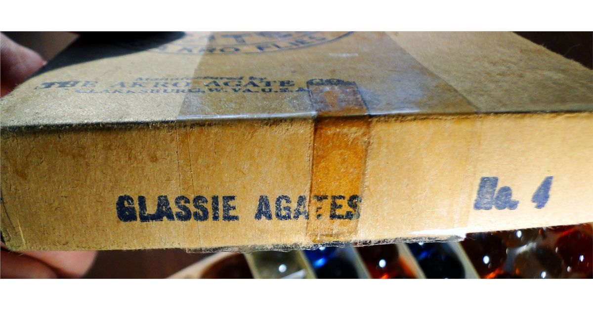 AKRO AGATE COMPANY, Original Package. Original box of 50 No. 4 Glassies. Assortment of clearies, all original to the box. The marbles are 7/8" and Mint. The box has the Akro logo on the front. Some minor water staining. Has packaging tape on it (acetone should remove it). Box is Near Mint.
