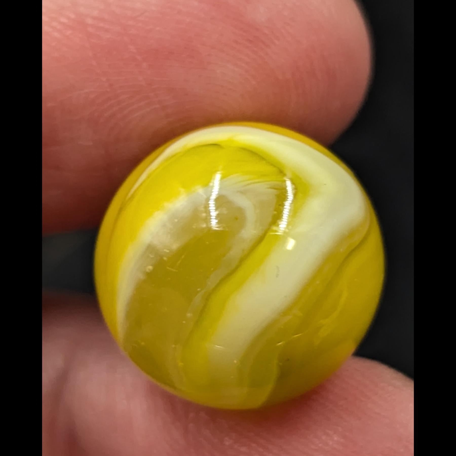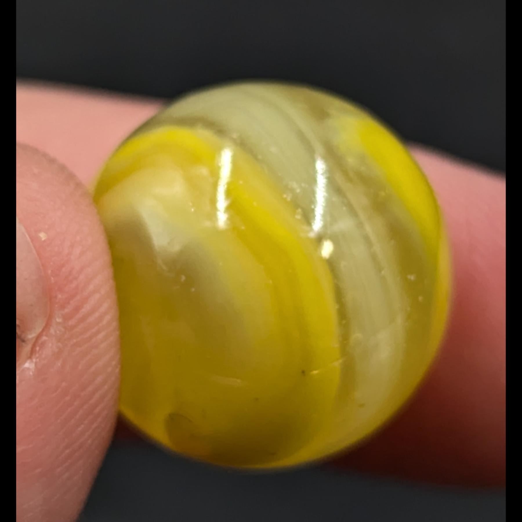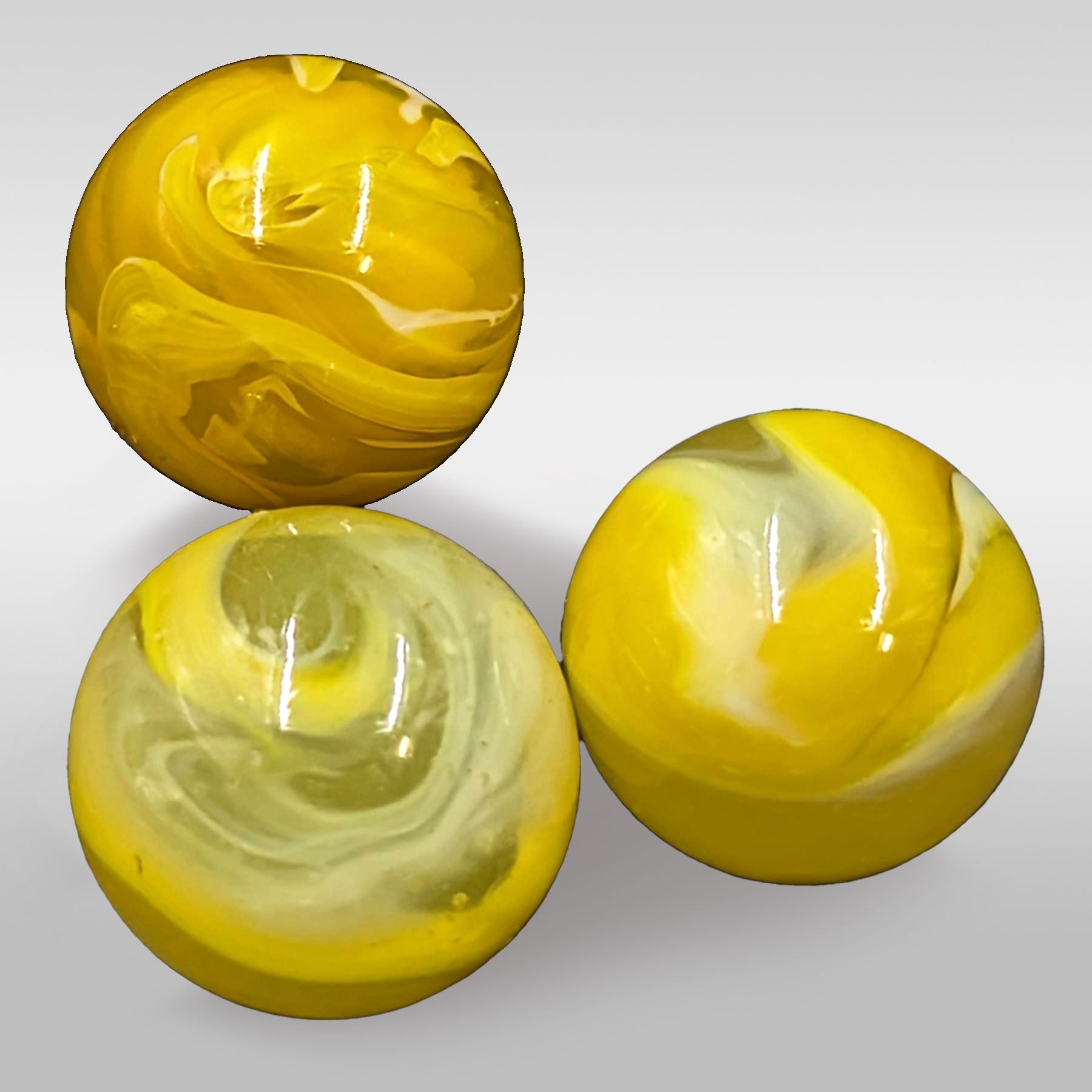 Marbles: Lot Of 3 Yellow Akro Agate Corkscrew Marbles. Two of the marbles are brightly florescent and the third marble is densely packed with yellow-orange threading throughout.