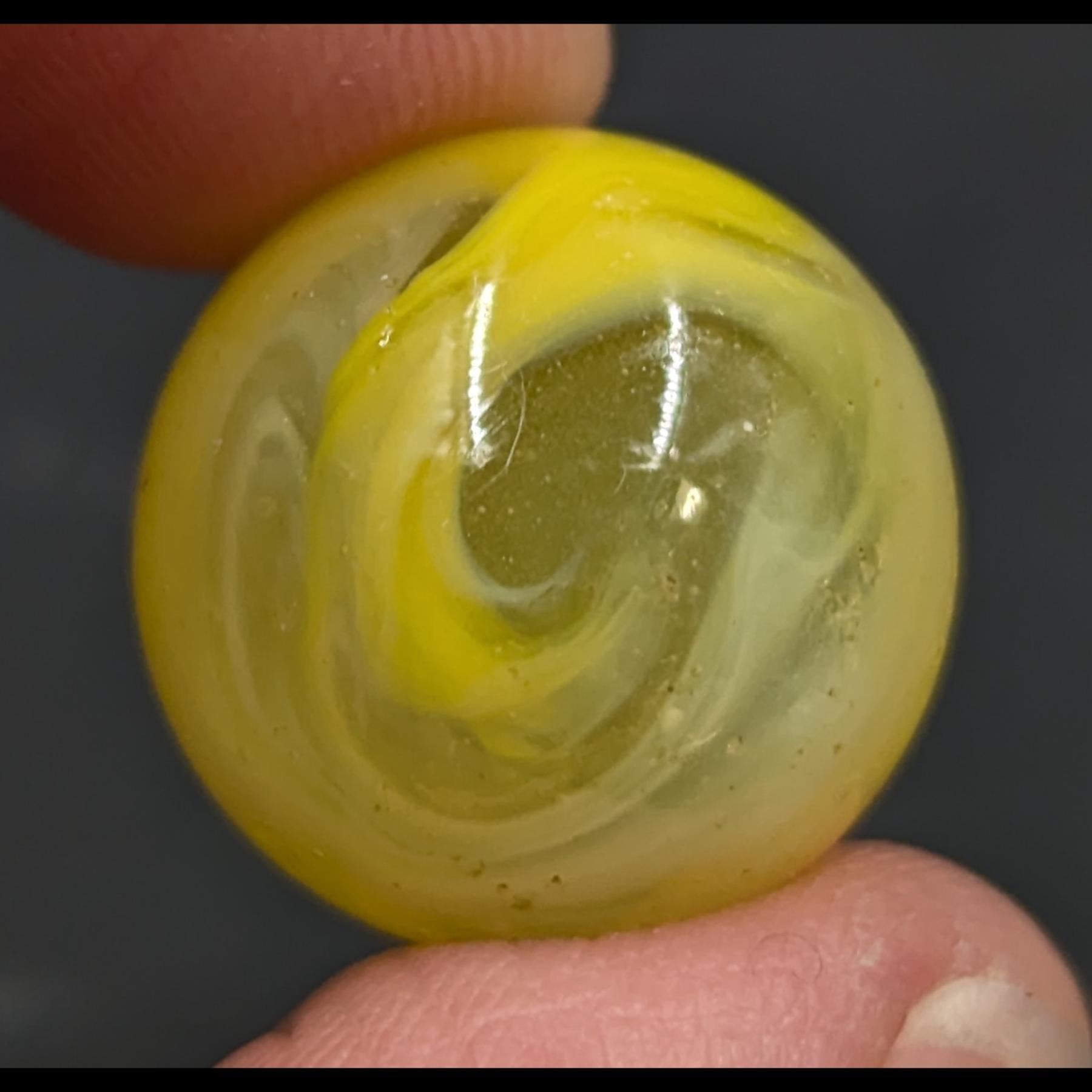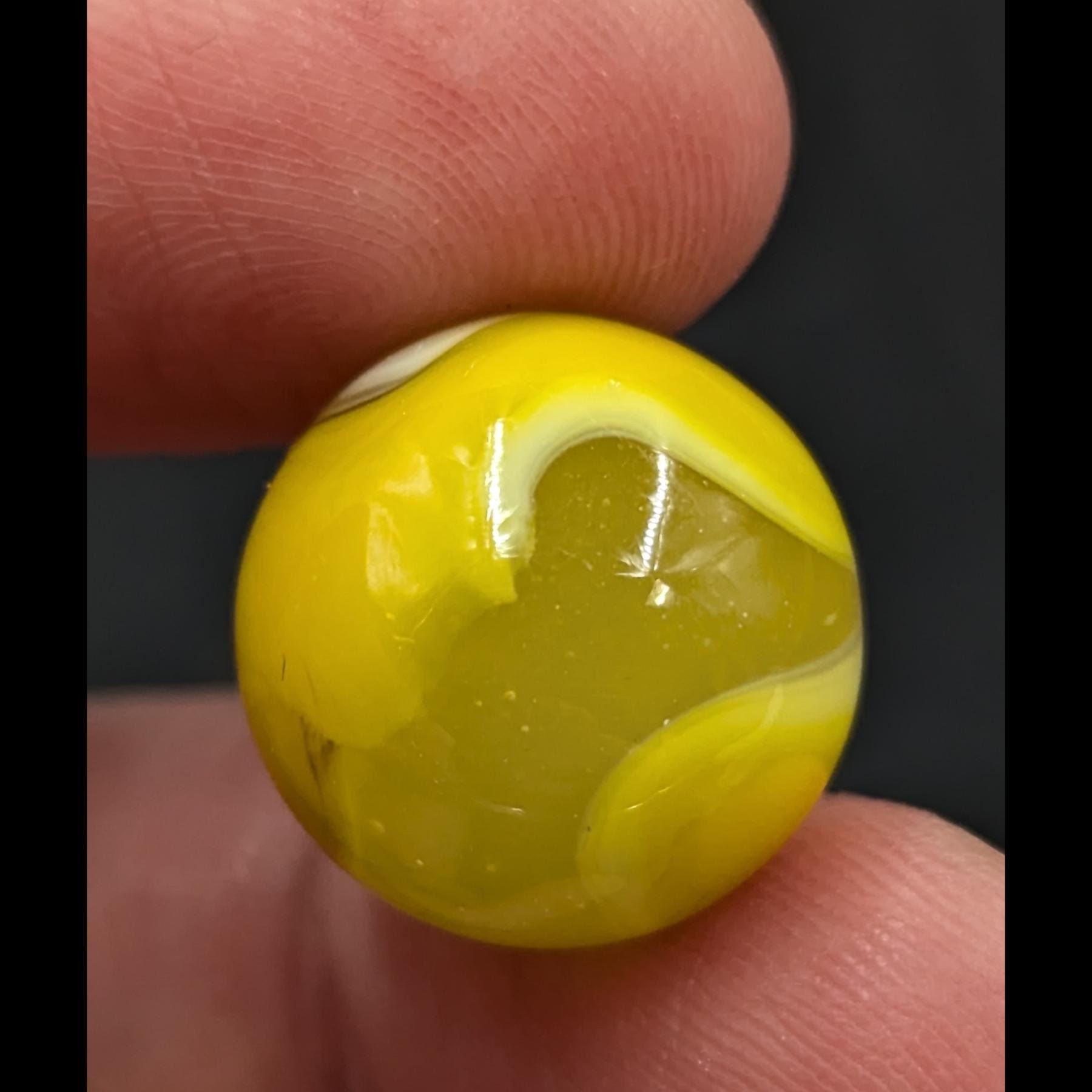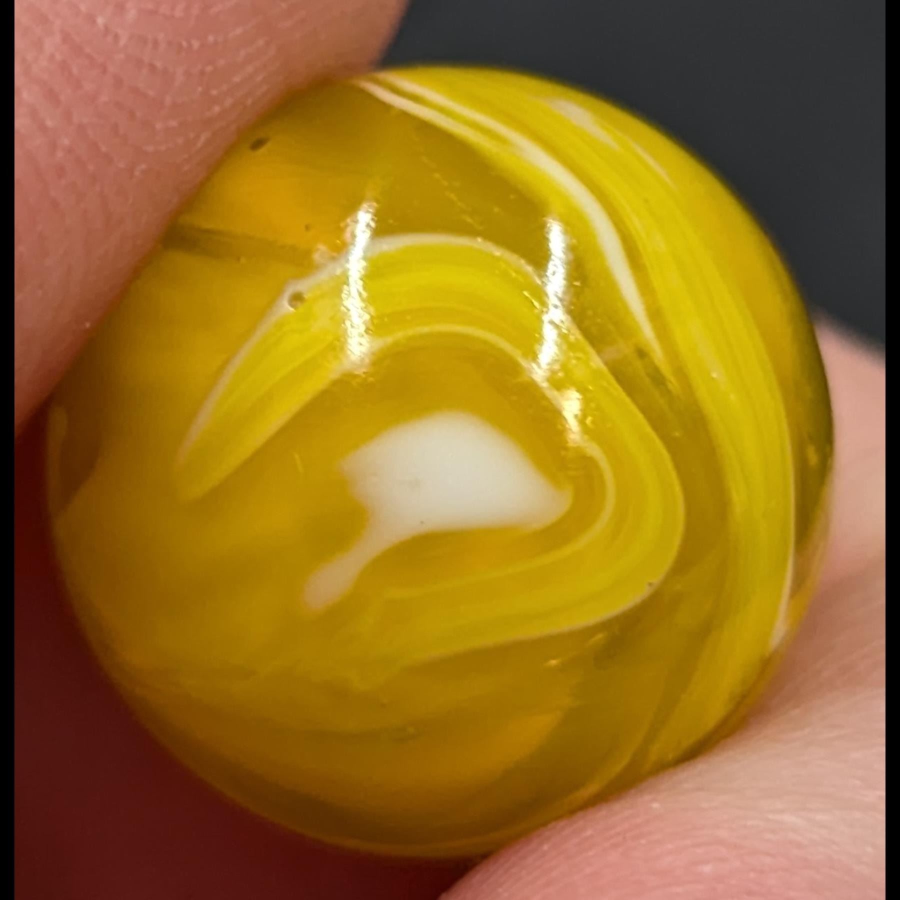 Marbles: Lot Of 3 Yellow Akro Agate Corkscrew Marbles. Two of the marbles are brightly florescent and the third marble is densely packed with yellow-orange threading throughout.