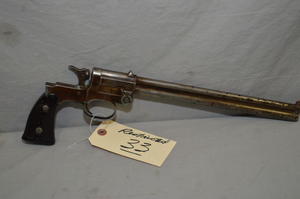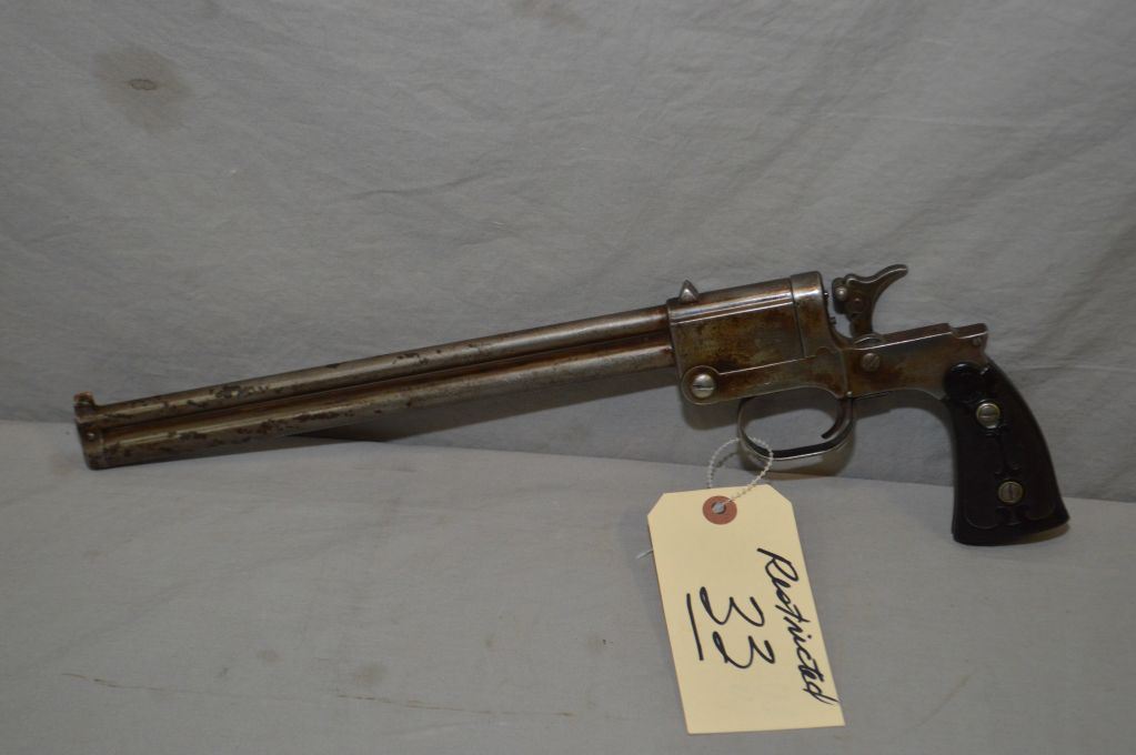 Marbles Model Game Getter .22 / .44 Cal 2 Shot Over & Under Pistol w/ 305 mm bbl [ fading blue finish turning brown with some patchy surface areas, Marbles checkered worn grips, missing the shoulder stock ] Ser # 1203 Restricted Handgun Cert # 13149894