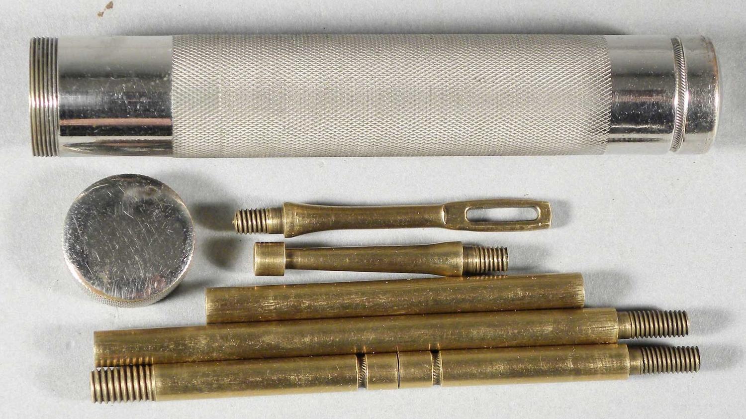 Marbles No. 99 Pistol Cleaning Kit. 38 cal., brass section with 2 tips. Nickel case. Marbles, Gladstone, MI. USA. Complete excellent original condition. 4 3/4 inches long.