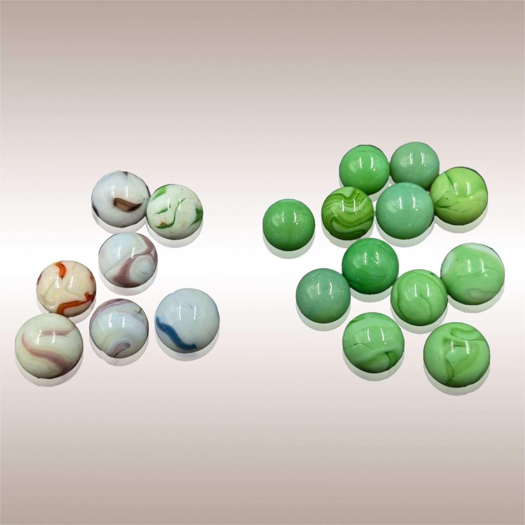 Marbles: Seven Possibly Ravenswood With Swirls And Twelve Green Game Marbles.
