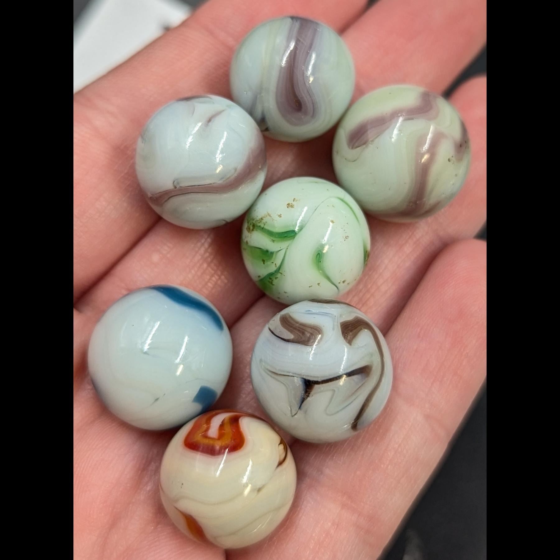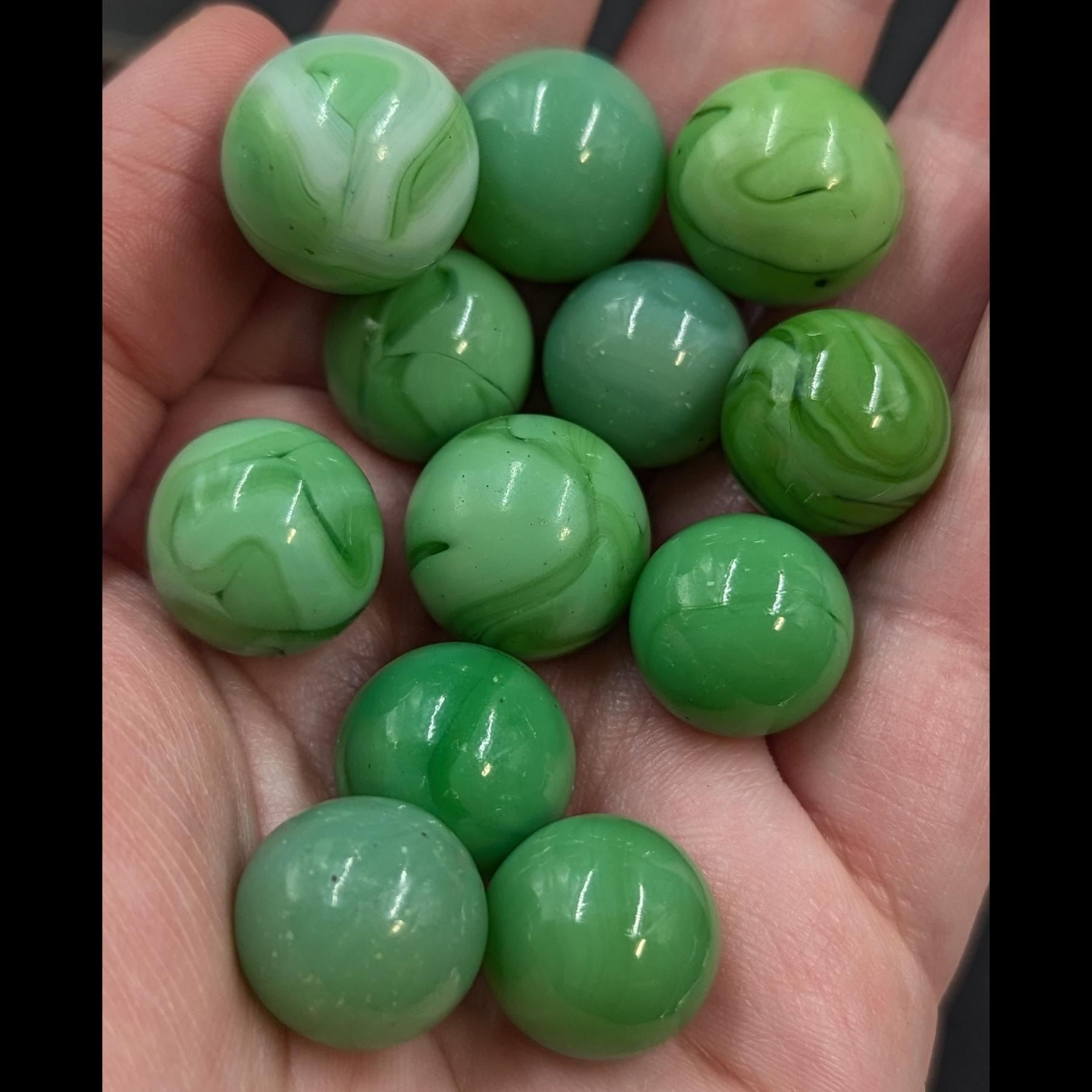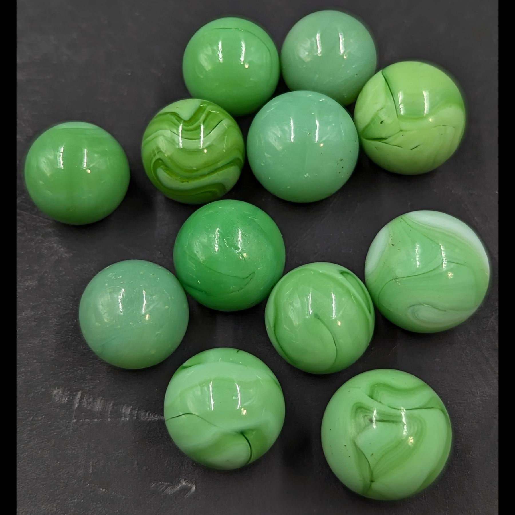 Marbles: Seven Possibly Ravenswood With Swirls And Twelve Green Game Marbles
