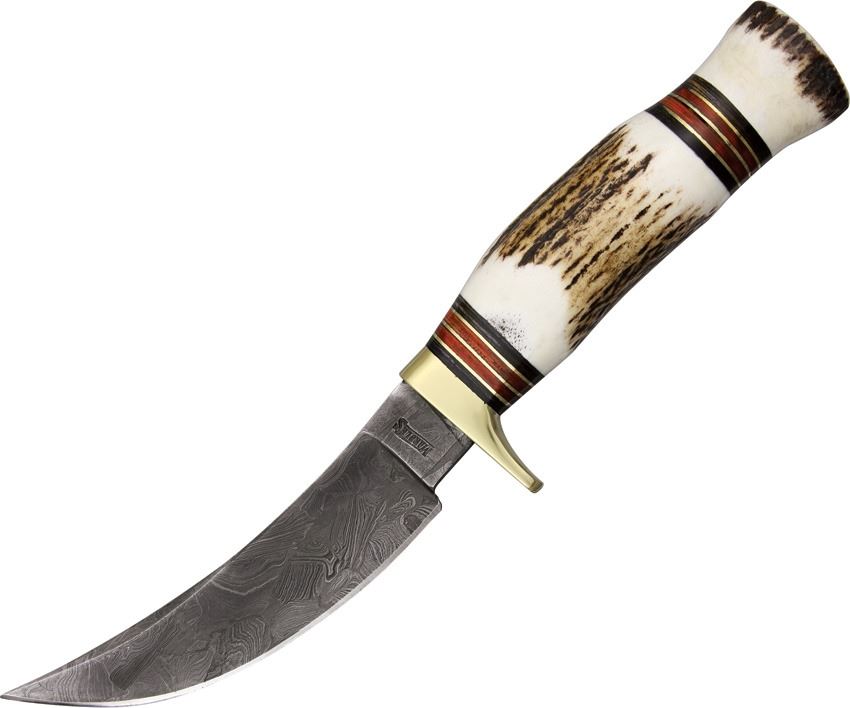 10 3/4" overall. 5 1/2" upswept Damascus steel blade. Round design stag handle with stag pommel. Brass finger guard. Brown leather belt sheath.