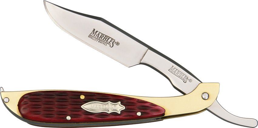 Sportsman's Razor Red - 5" closed. 3 1/4" 440A stainless clip blade with 2 1/8" cutting edge. Brass body with exposed liners. Red jigged bone handles. Nickel silver inlay shield.