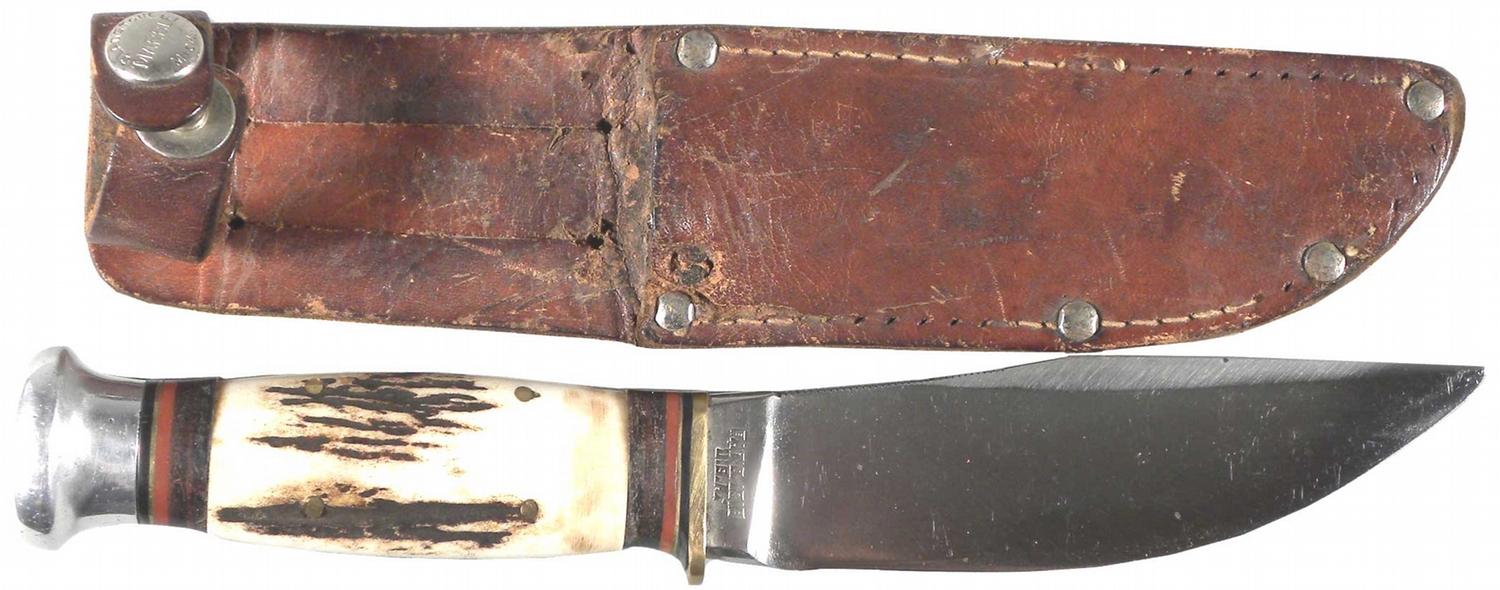 Marbles Stag Handled Knife in original leather sheath. Patent date 1816. Marbles Gladstone, MI. USA. Knife in excellent condition, sheath in good used condition. 4 1/4 inch blade.