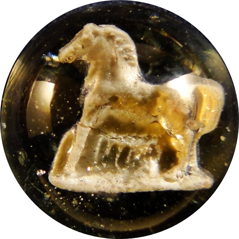 SULPHIDE. Beautiful Sulphide of a horse. Standing horse, head turned slighly to one side. There is a crack in the figure, along the legs. Large figure for the small marble. No air bubbles. Surface is wet Mint. Germany, circa 1870-1920. 1-1/16". Mint (9.9).