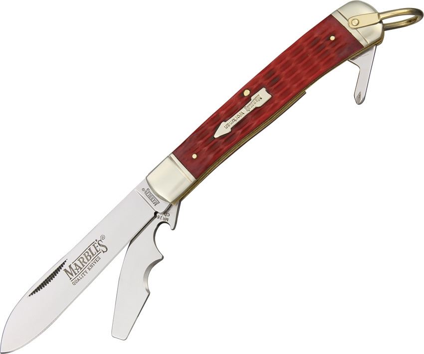 Workman Series Trapper - With Screwdriver. 4 1/8" closed. Stainless clip blade. Features flat head screwdriver with bottle opener and wire stripper, Phillips screwdriver and bail. Red jigged bone handles with nickel silver bolsters and Workman inlay shield.